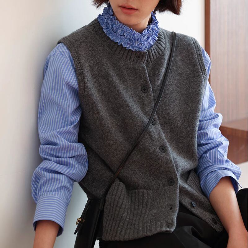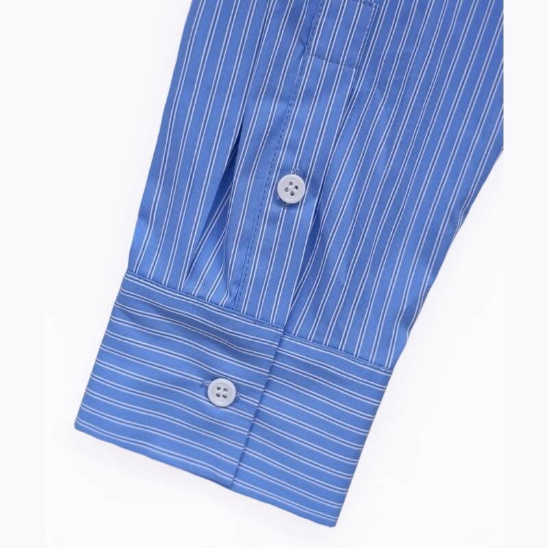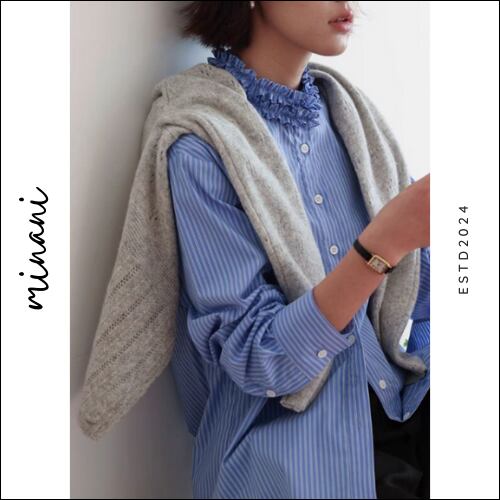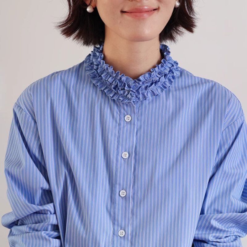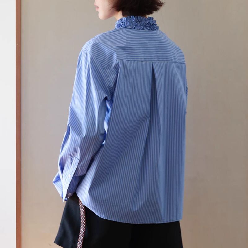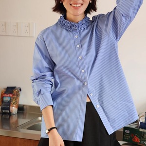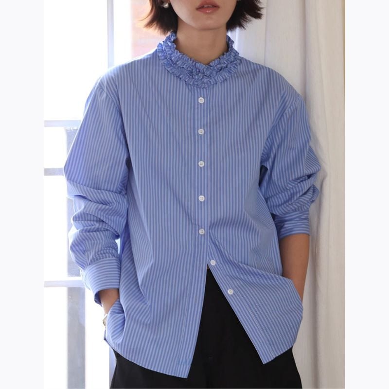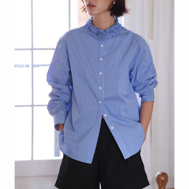 ゆったりとしたシルエットと爽やかなストライプ柄が魅力のロングスリーブシャツ。スタンドカラーとフリルが女性らしさを演出します。カジュアルなスタイルからきれいめスタイルまで幅広く活躍する一枚です。デイリーユースはもちろん、週末のお出かけにもおすすめです。