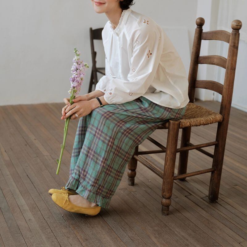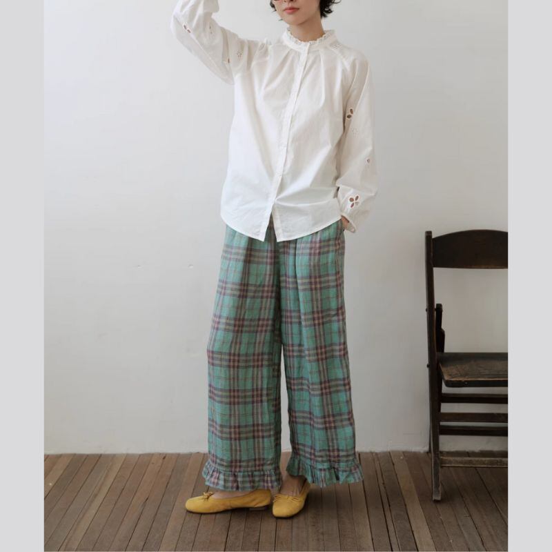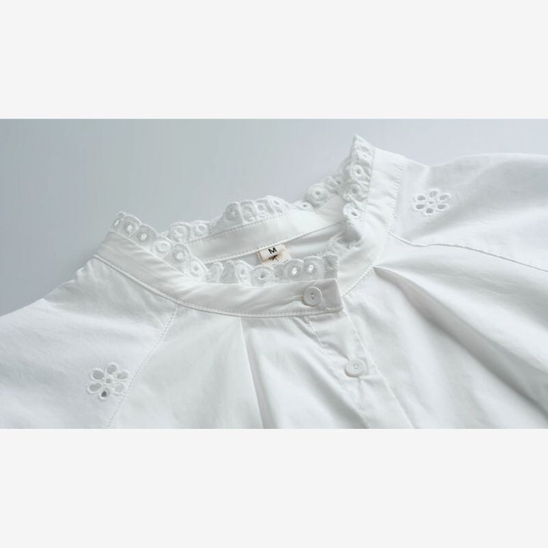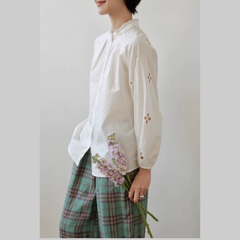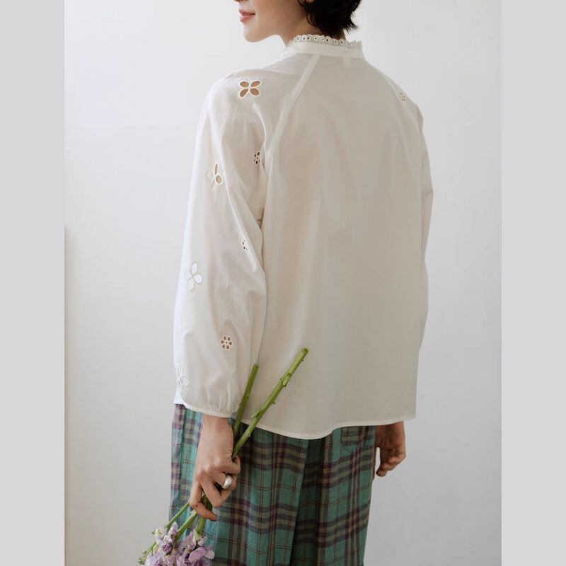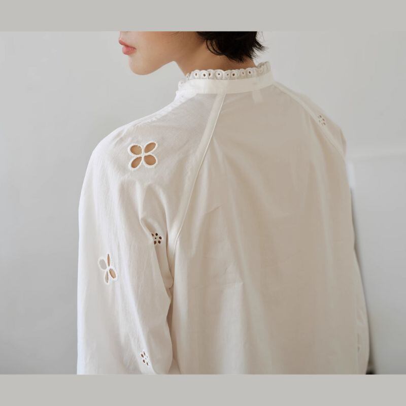 アイレット刺繍が施されたスタンドカラーのロングスリーブシャツ。繊細な刺繍が、さりげないアクセントを添えます。程よくゆとりのあるシルエットで、着心地も抜群。普段使いはもちろん、特別な日の装いにもぴったりです。カジュアルなボトムスと合わせれば、リラックス感のあるスタイリングに。スカートと合わせれば、フェミニンな印象に仕上がります。様々なコーディネートを楽しんでいただけます。