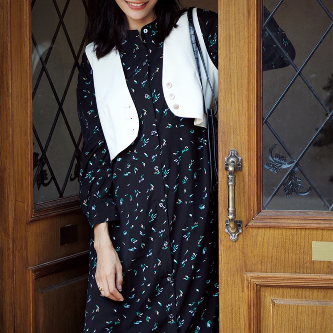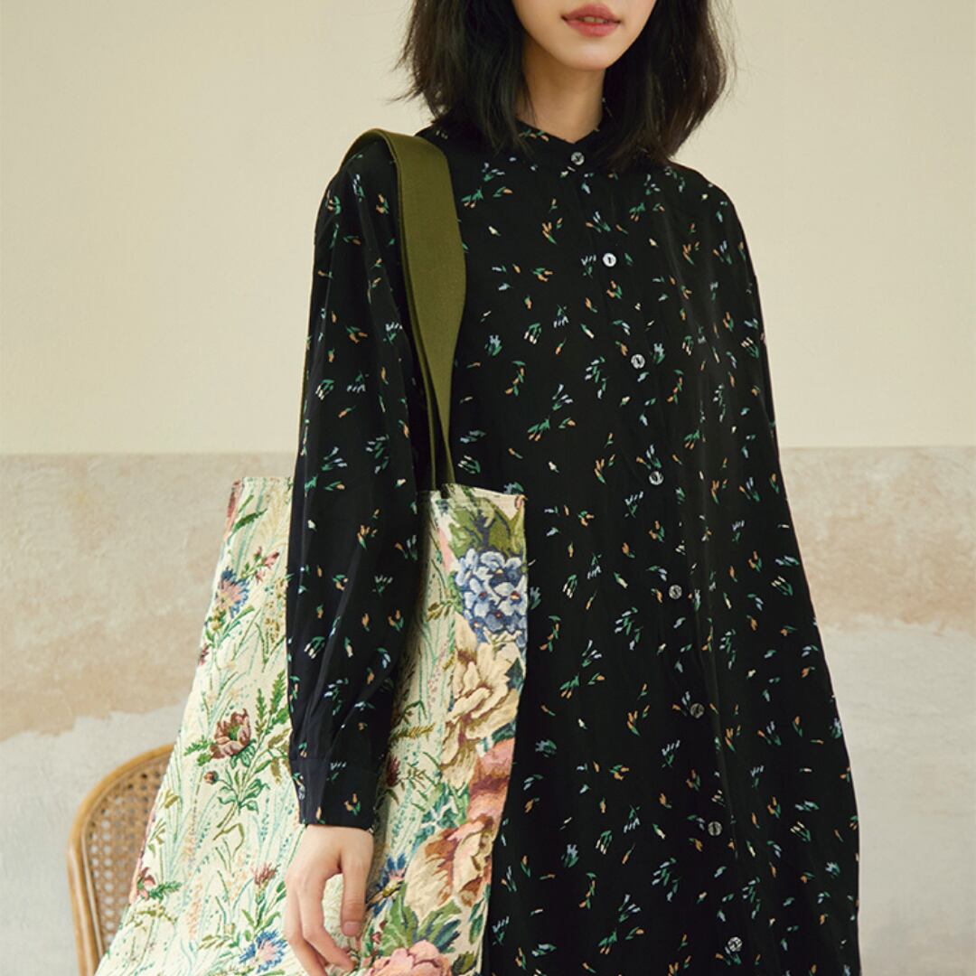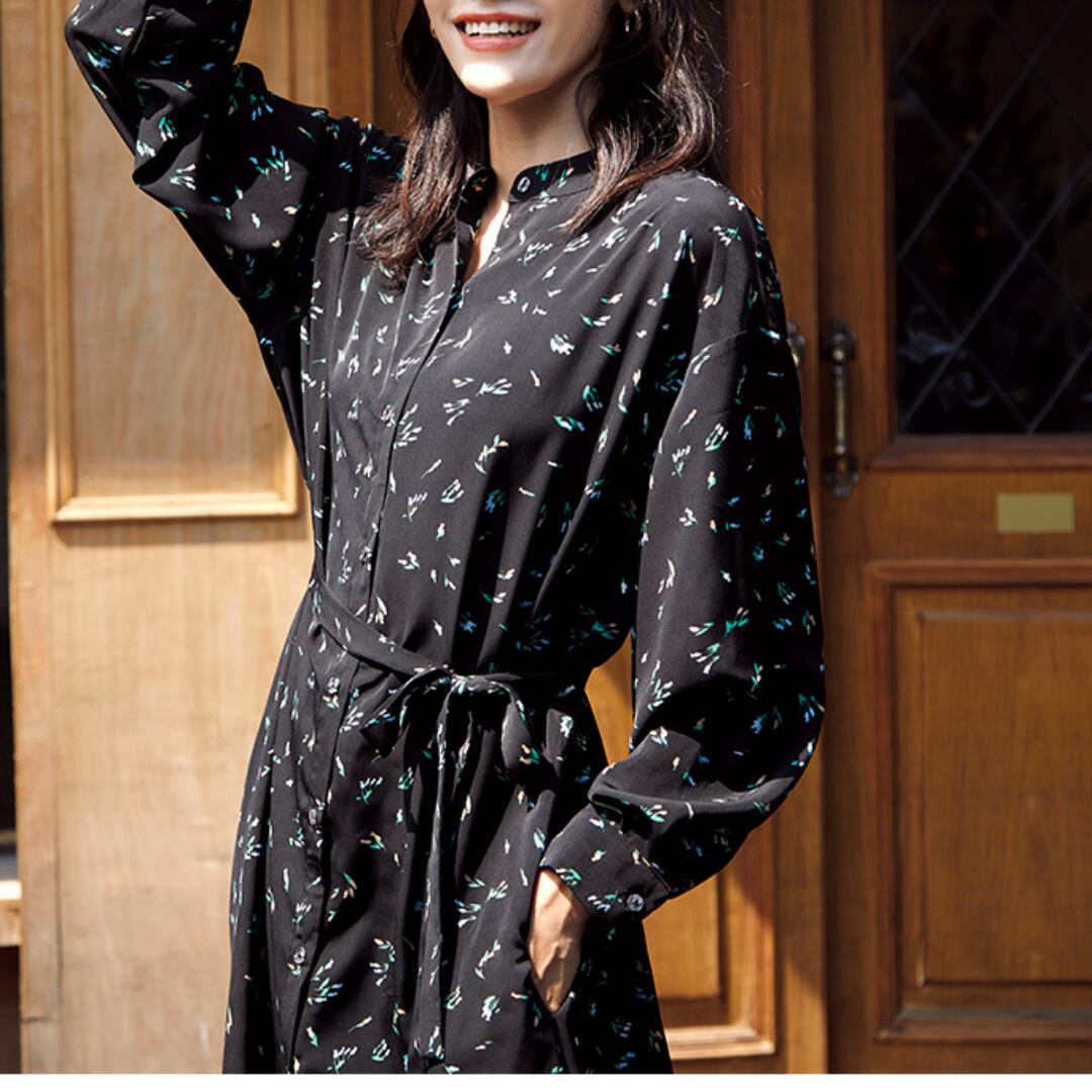 一枚で様になる、スタンドカラーのAラインロングシャツドレス。さりげない小花柄が、落ち着いた雰囲気を演出します。ロング丈が上品さを際立たせ、普段使いはもちろん、ちょっとしたお出かけにも最適。一枚持っていると着回し力抜群で、様々なシーンで活躍してくれるでしょう。