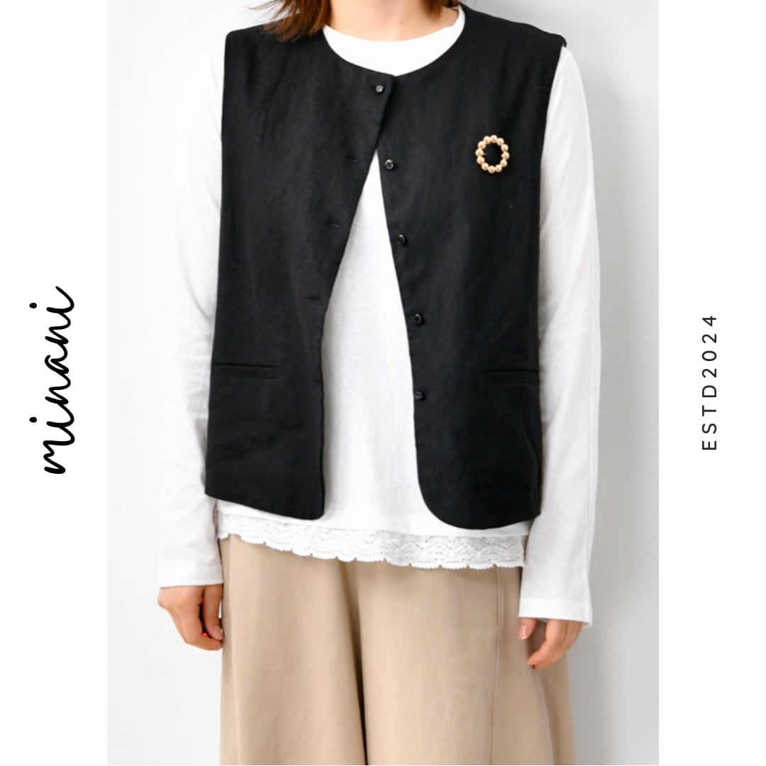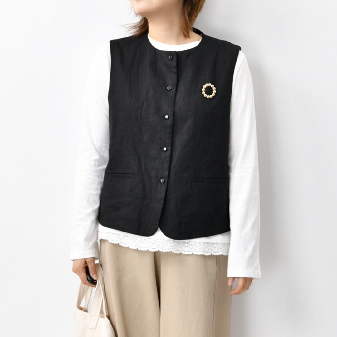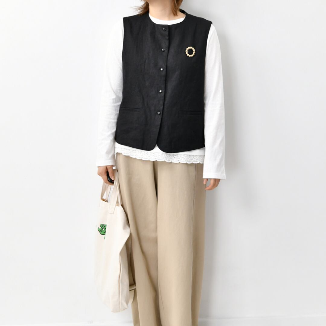 5ボタンのフロントと便利なポケット付きのベストは、着こなしに程よいアクセントを与えます。シンプルなデザインながら、上品な印象で様々なスタイルに合わせやすく、デイリーユースに最適です。一枚あると着回し力抜群で、季節の変わり目の羽織りとしても活躍します。