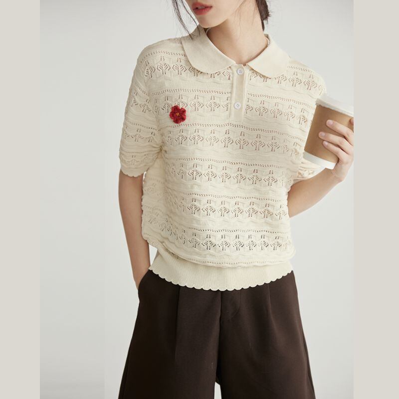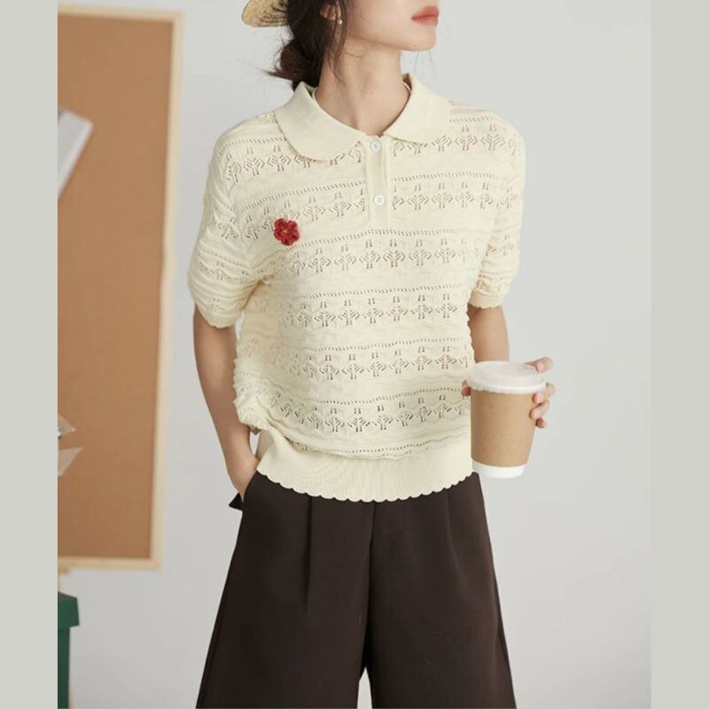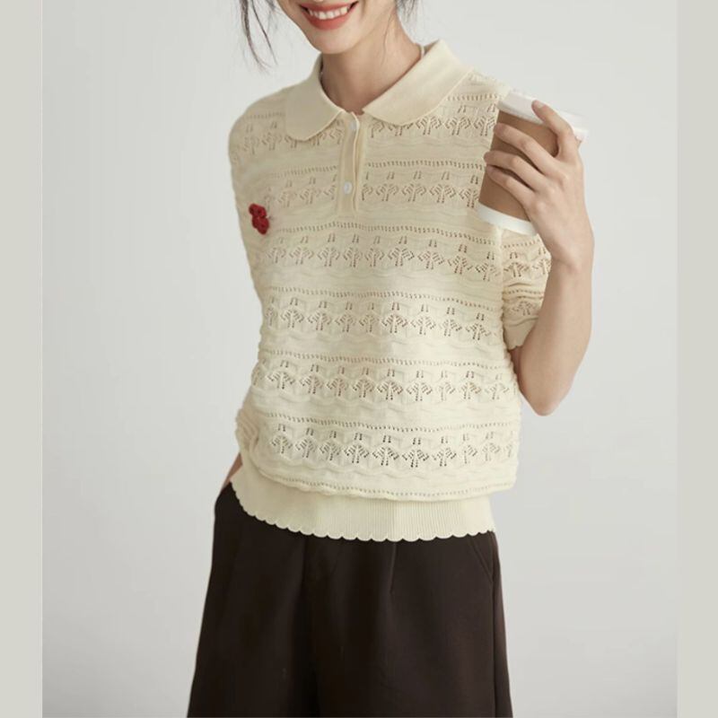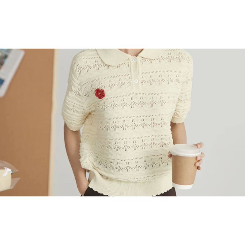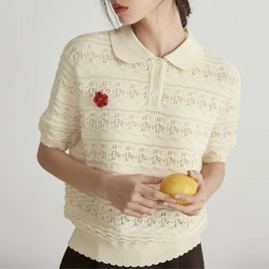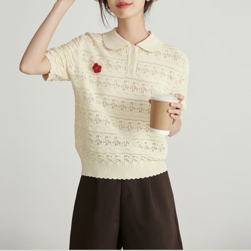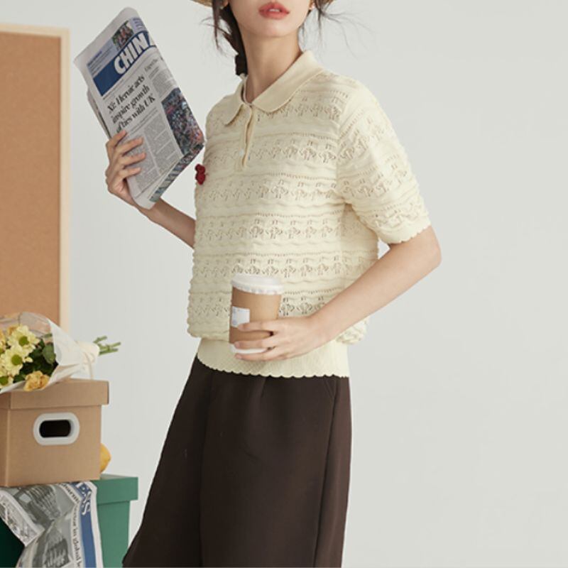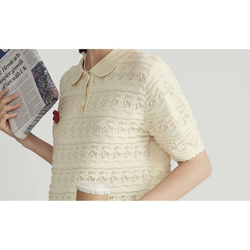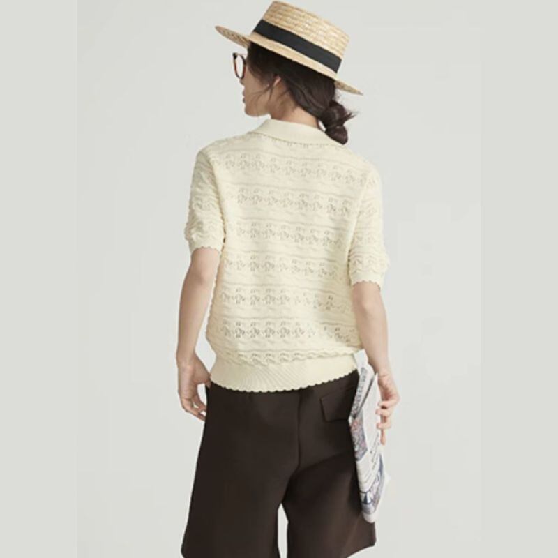 上品な透かし編みが美しいニットポロシャツ。繊細なデザインとすっきりとしたシルエットが、大人の女性らしさを演出します。