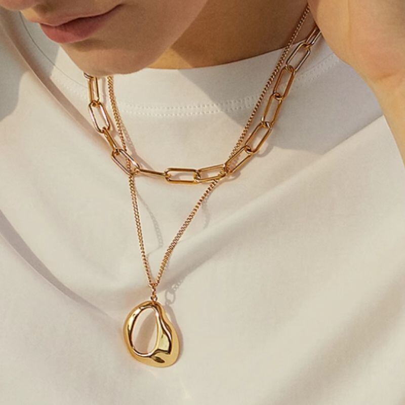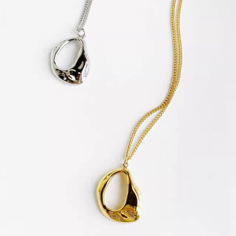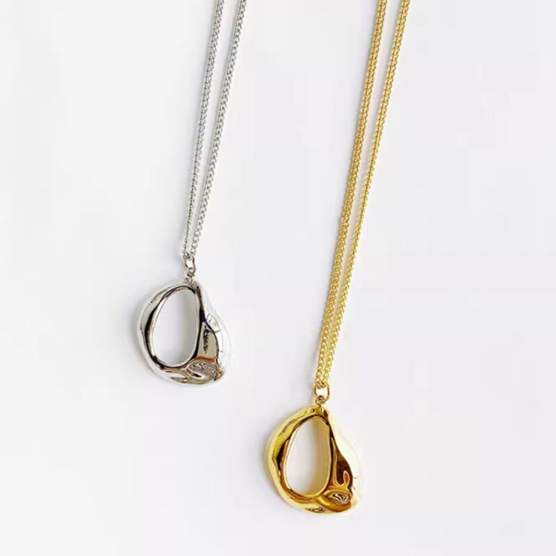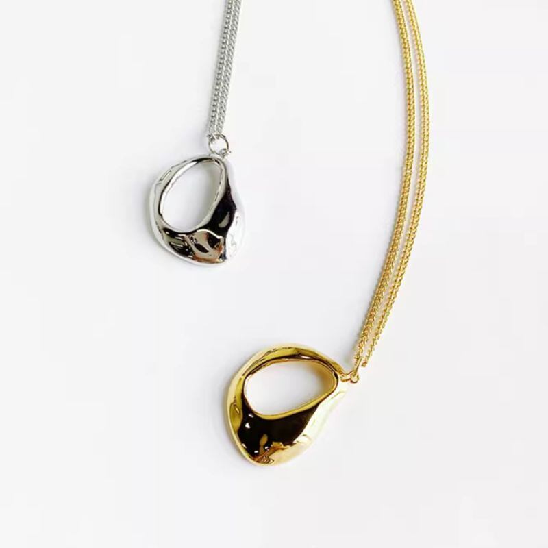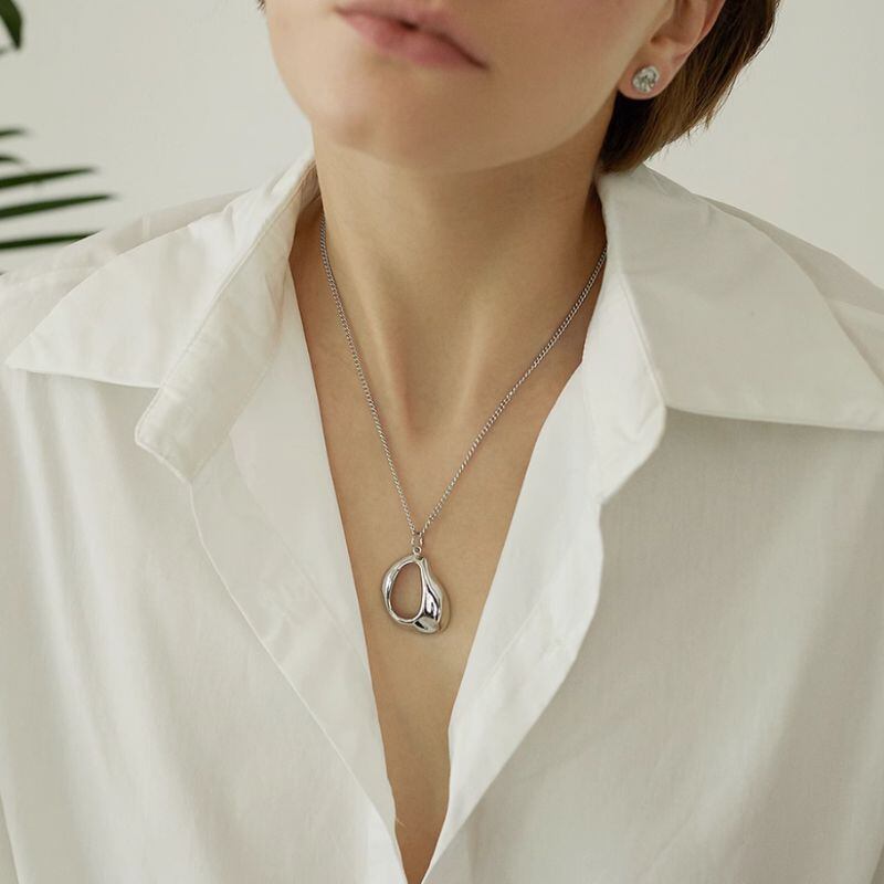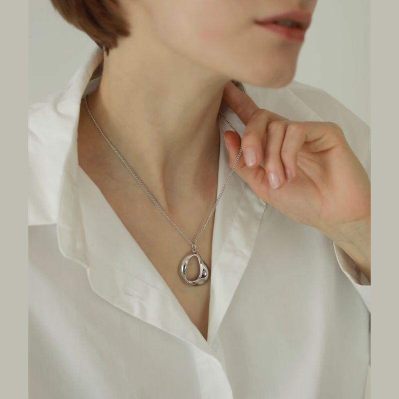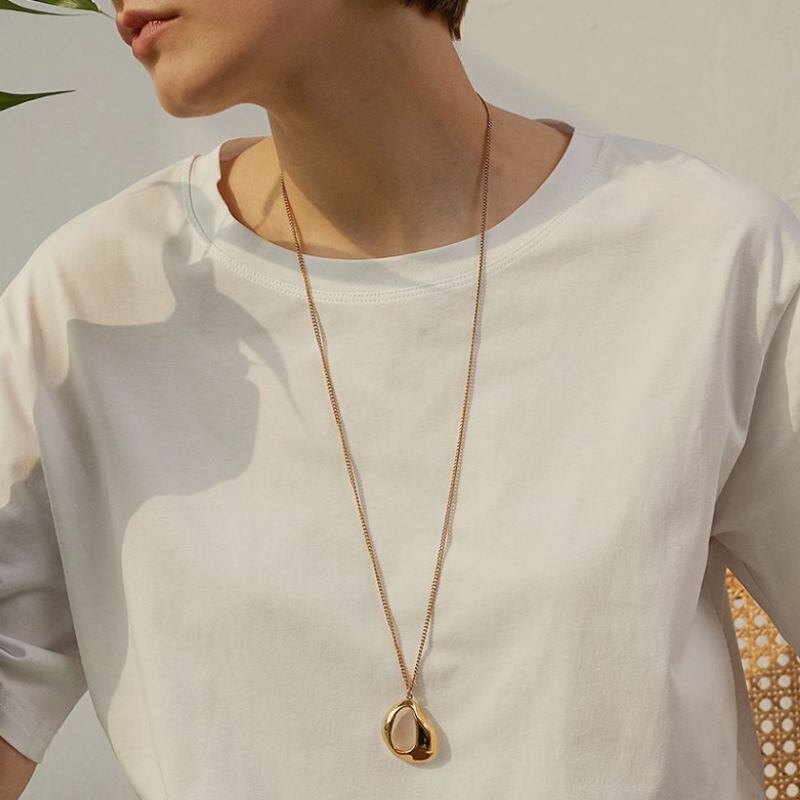 シンプルなデザインが魅力のロングネックレス。クルーネックのトップスに合わせやすい長さと、主張しすぎないペンダントが、洗練された印象を与えます。