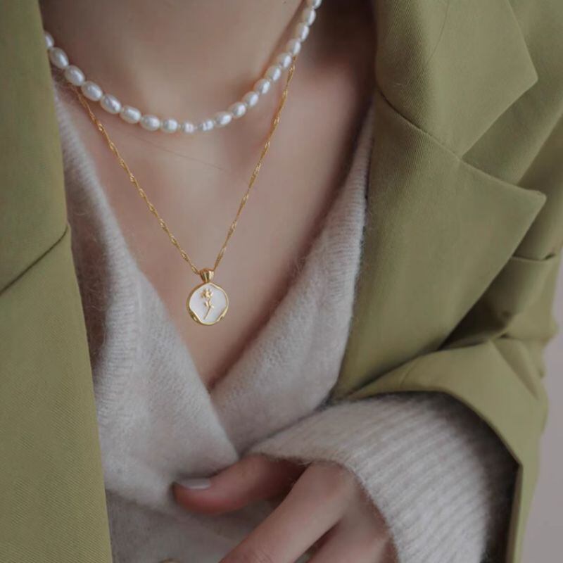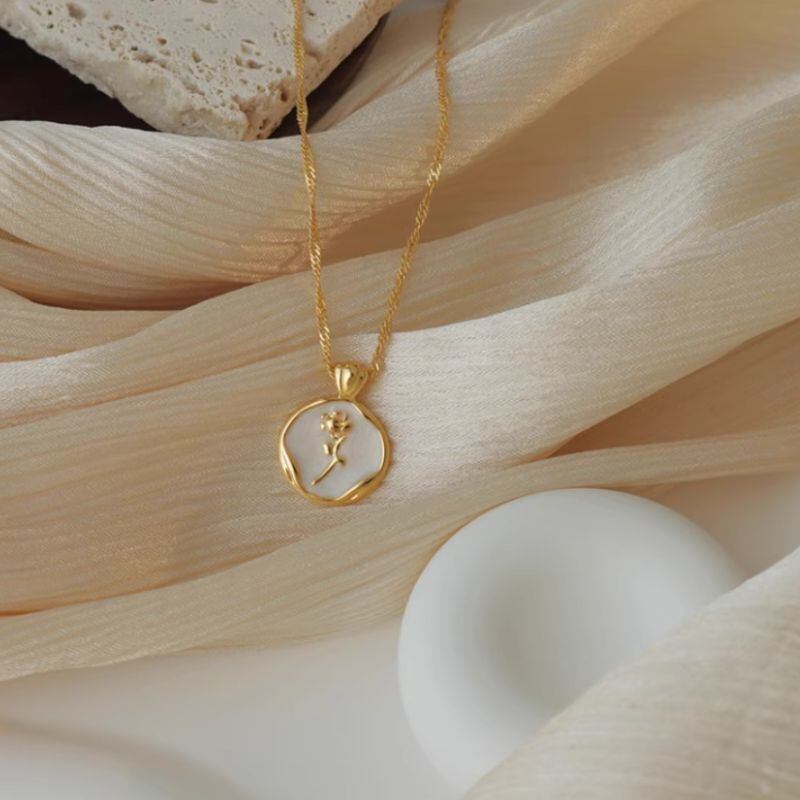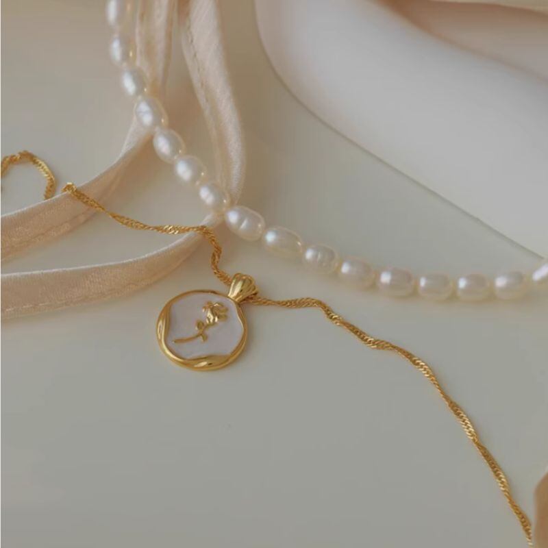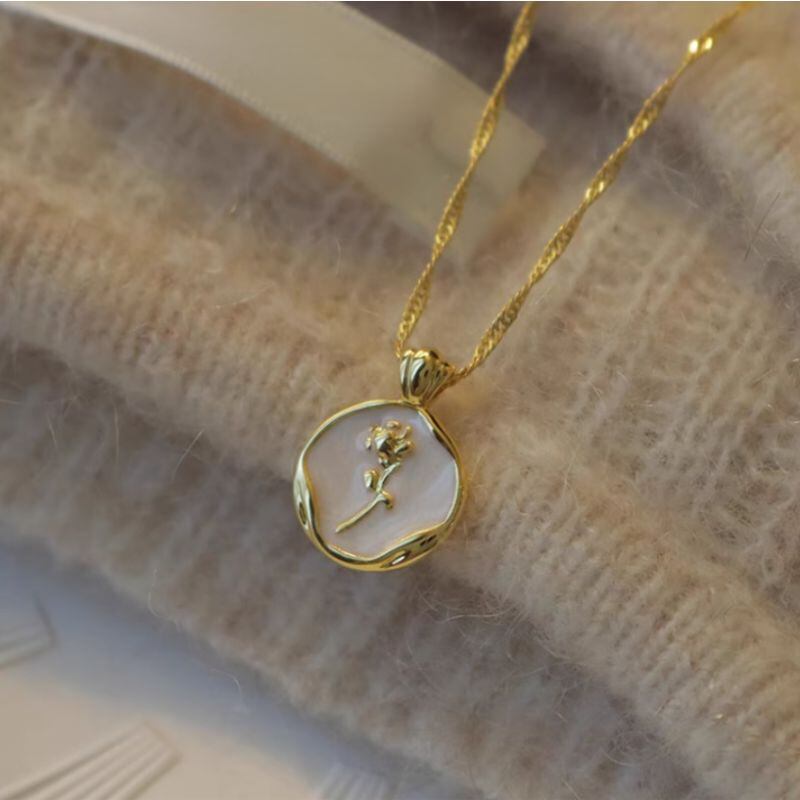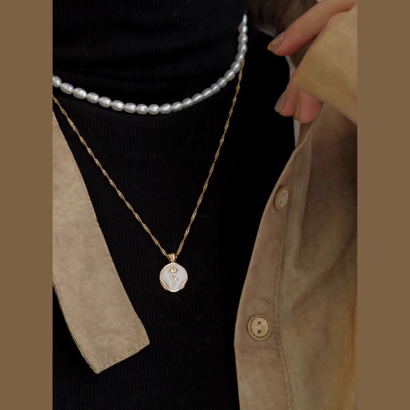 繊細なローズモチーフが、上品な輝きを放つネックレス。ゴールドのチェーンと、柔らかなクリーム色の円形ペンダントの組み合わせが、洗練された雰囲気を演出します。