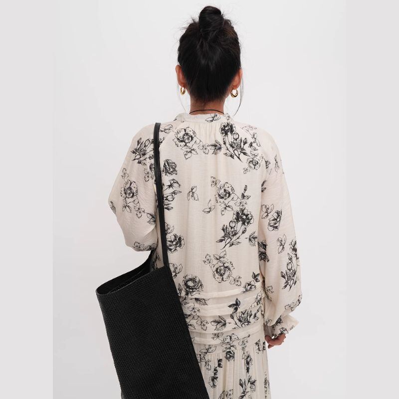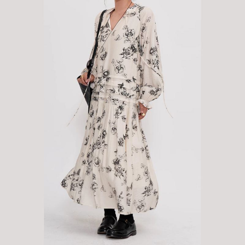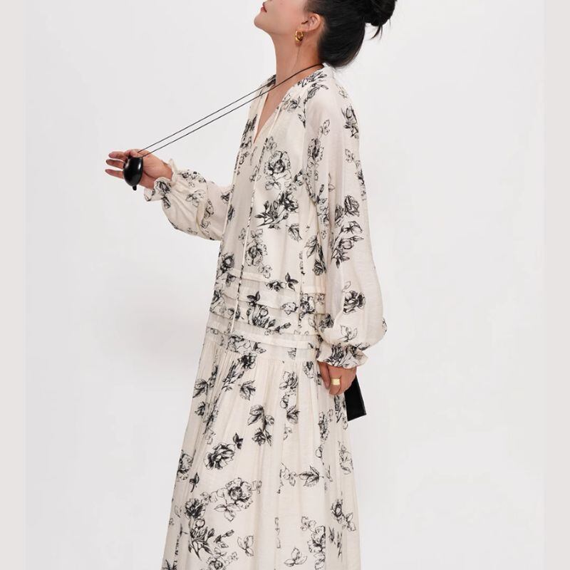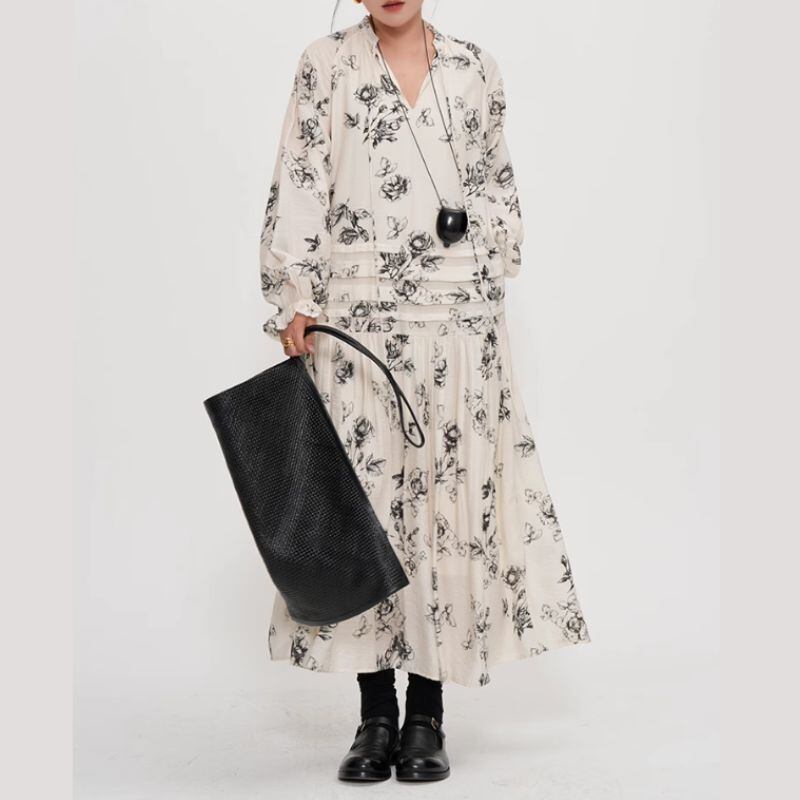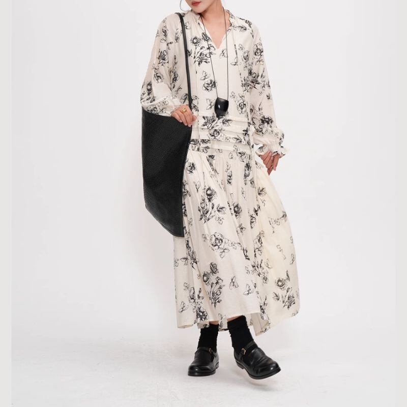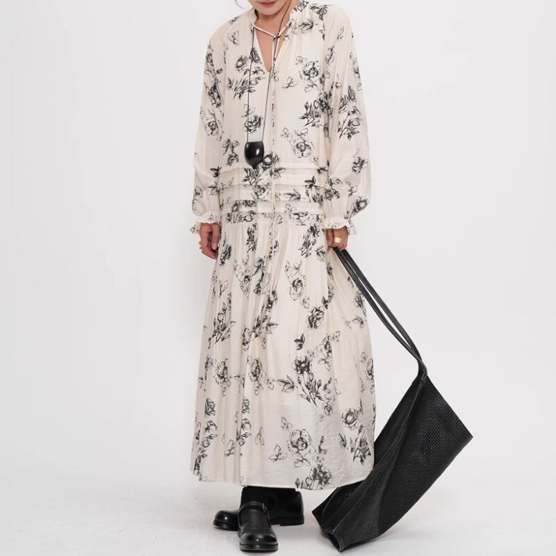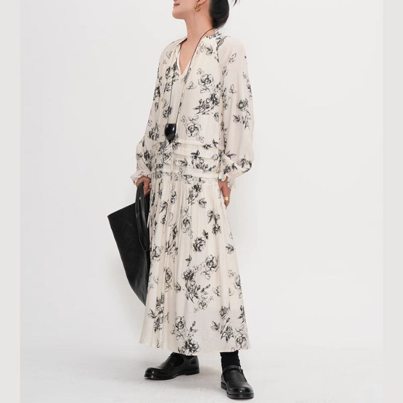 シックなボタニカル柄が目を惹くロングドレスは、一枚で着映えするアイテムです。Vネックのデザインが顔周りをすっきりさせ、ロング丈のスカートがスタイルアップ効果も期待できます。