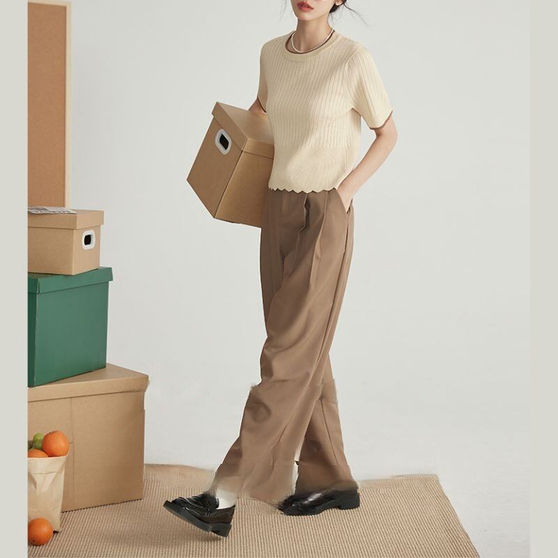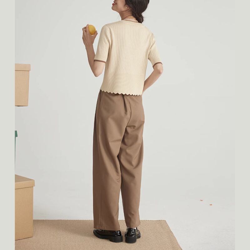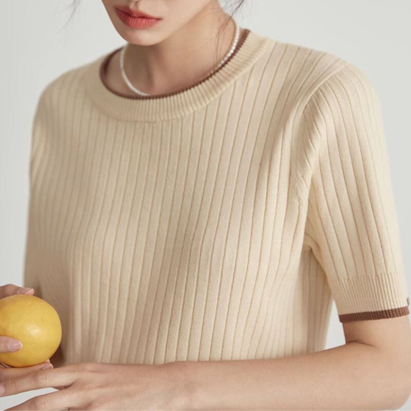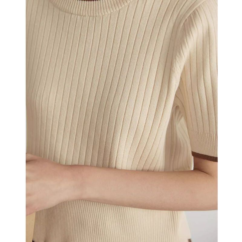 クルーネックデザインのショートスリーブニット。リブ編みの優しい肌触りと、さりげなく施されたパイピングがポイントです。