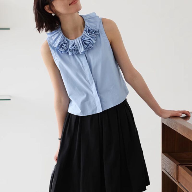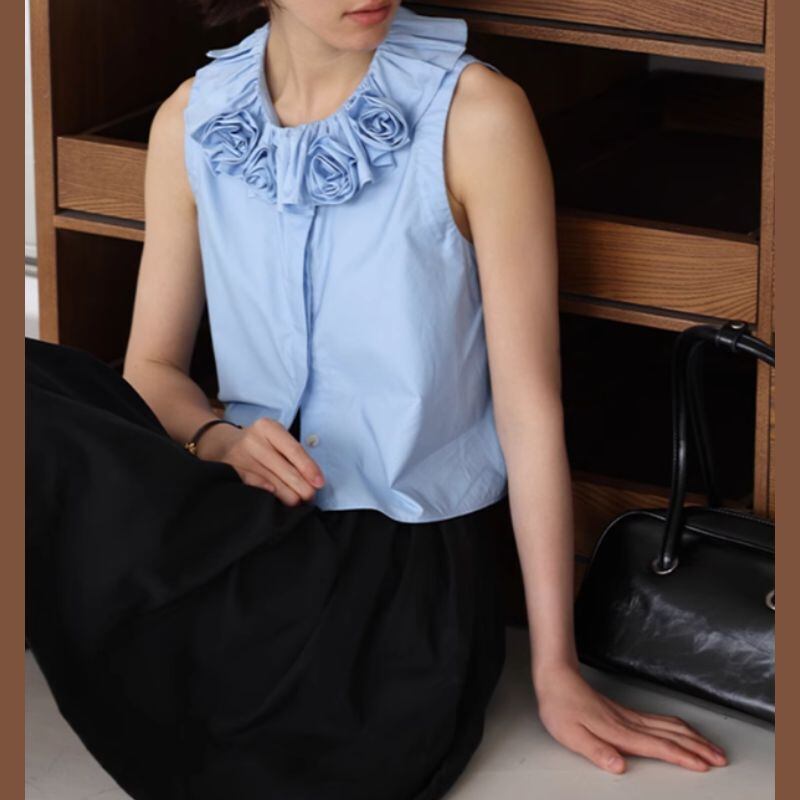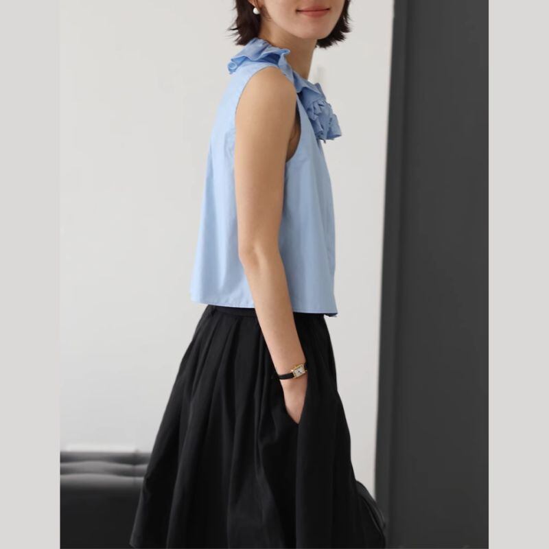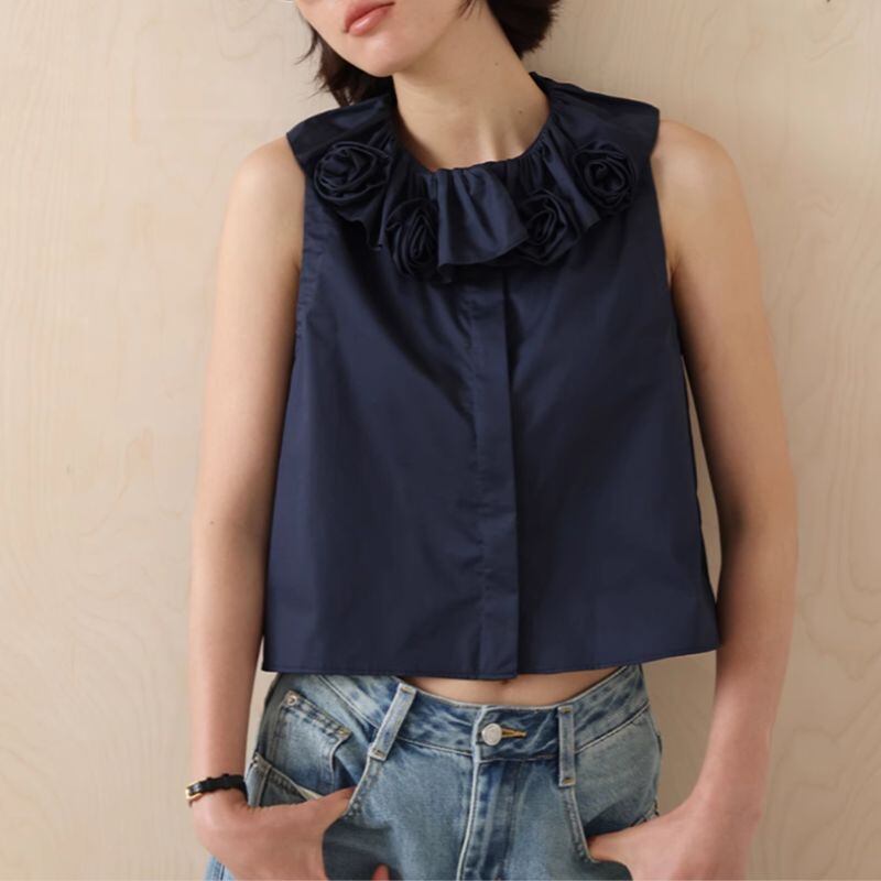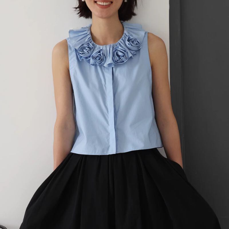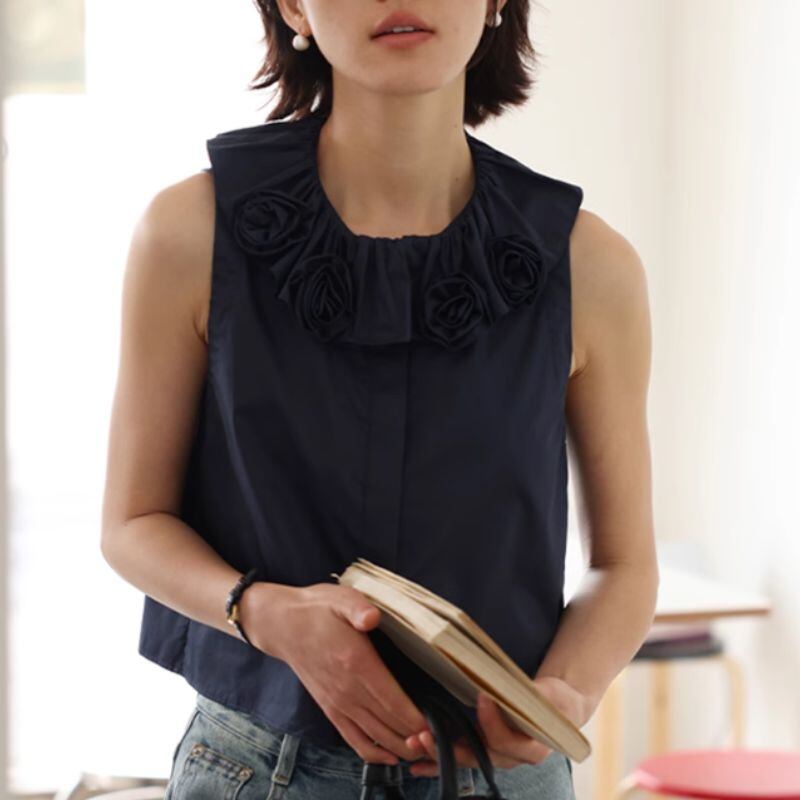 洗練されたデザインと着心地の良さを両立した、ノースリーブブラウス。首元のローズモチーフの装飾が、上品で華やかな印象を与えます。