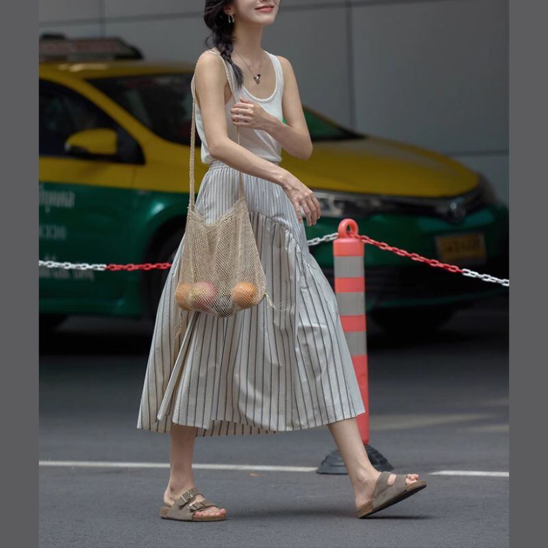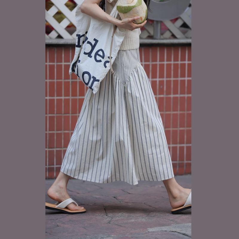 ストライプ柄と無地の生地の切り替えが、スタイルに動きと奥行きを与えます。
