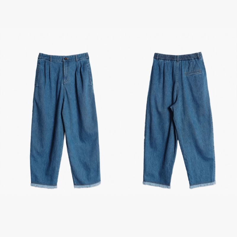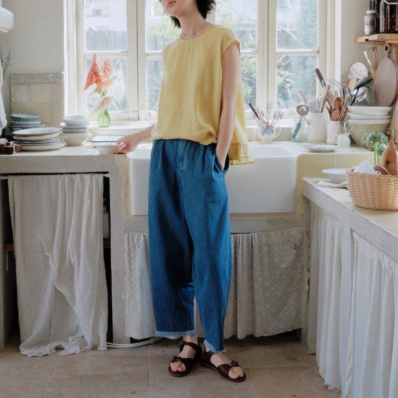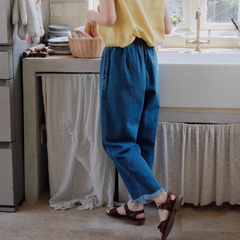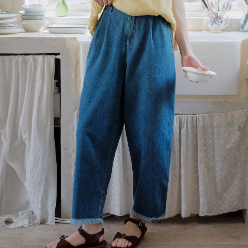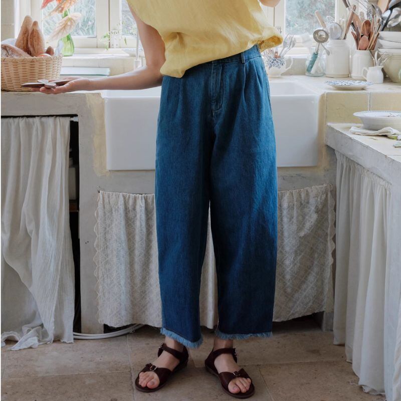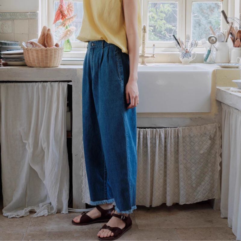 裾フリンジがさりげなくおしゃれなハイウエストワイドレッグデニムパンツ。ゆったりとしたシルエットで体型カバーも叶えつつ、ハイウエストデザインで脚長効果も期待できます。