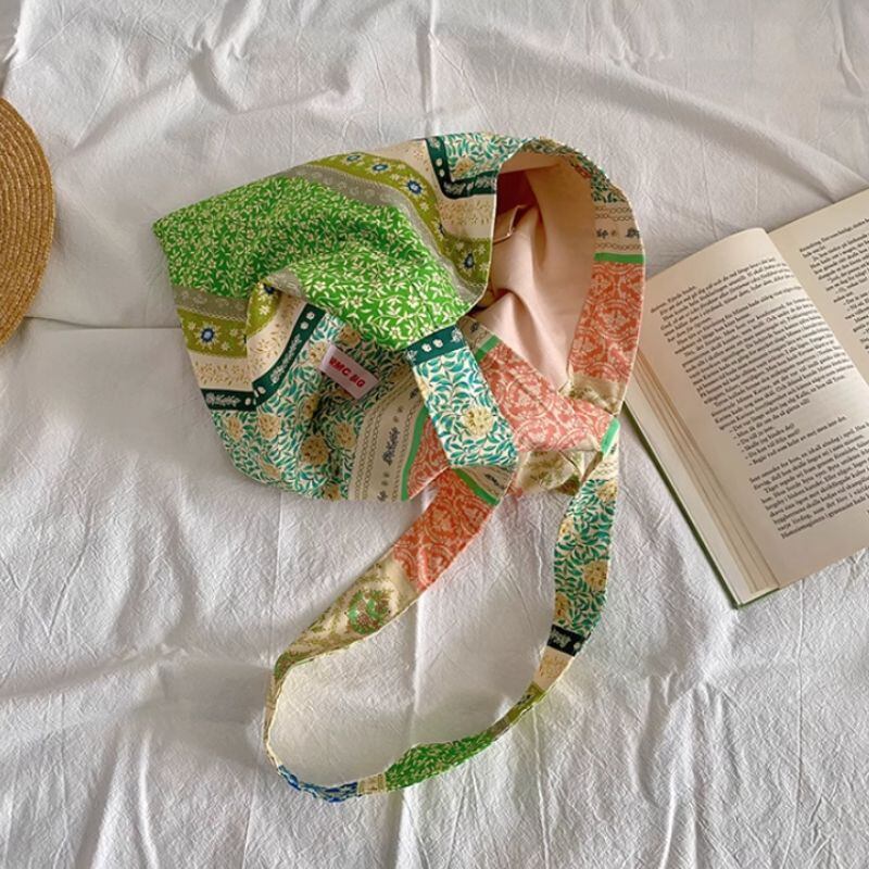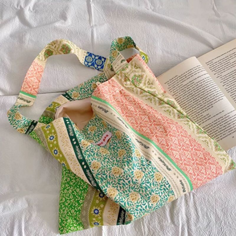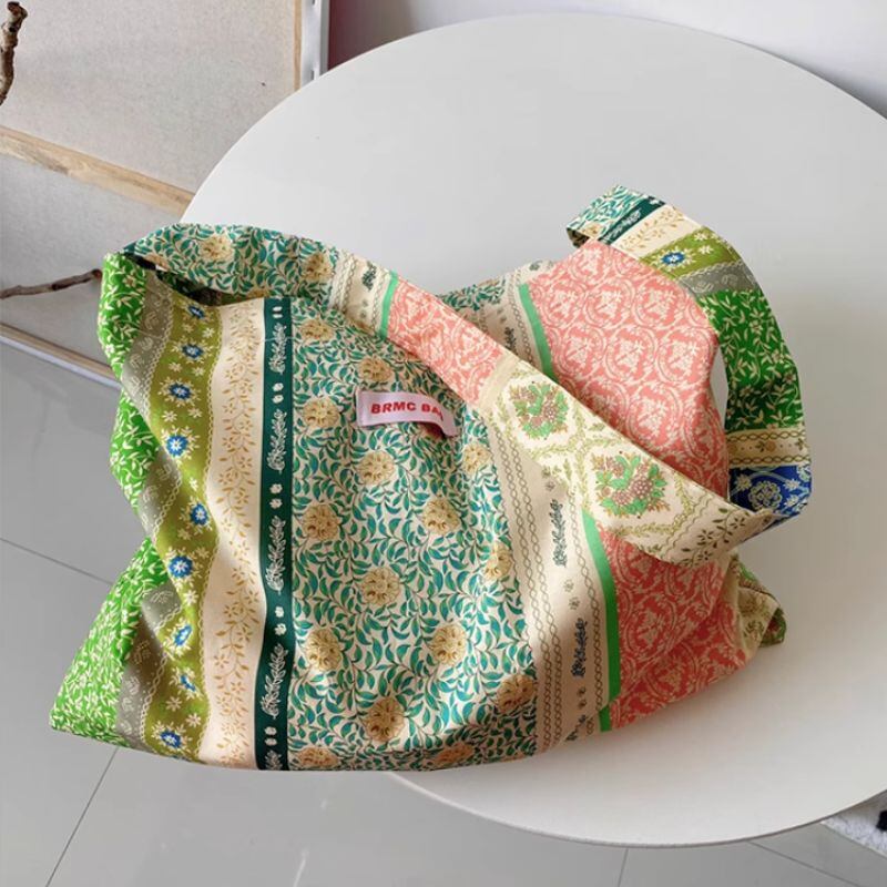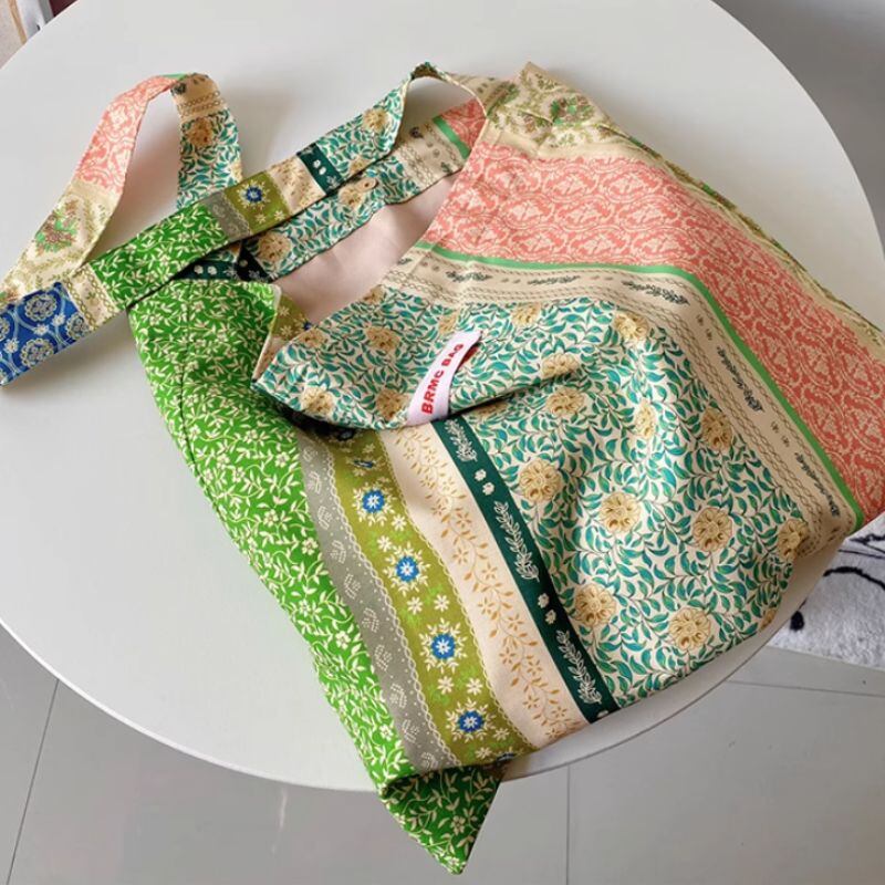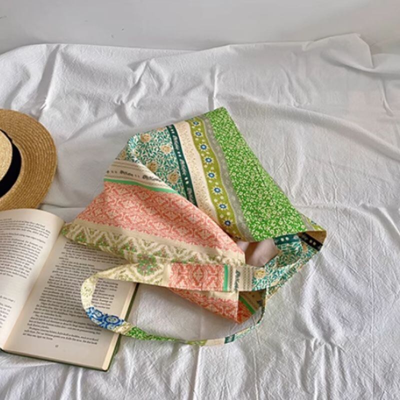 鮮やかなパッチワーク柄が目を惹く、魅力的なトートバッグです。様々な柄の生地を組み合わせたデザインは、カジュアルなスタイルから、ちょっぴり上品な装いまで、幅広いシーンで活躍します。
