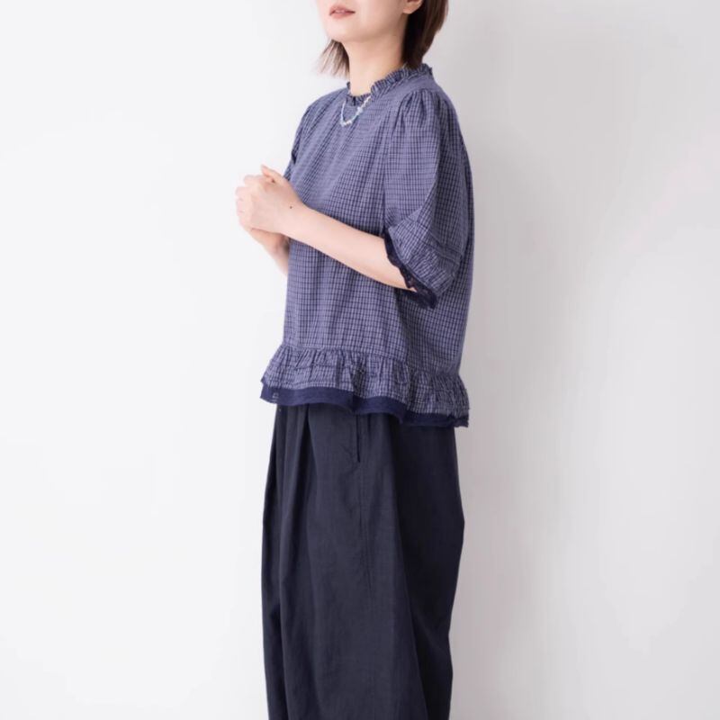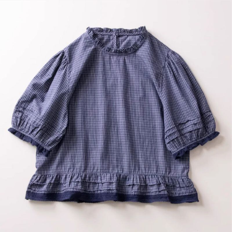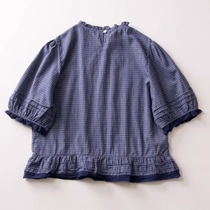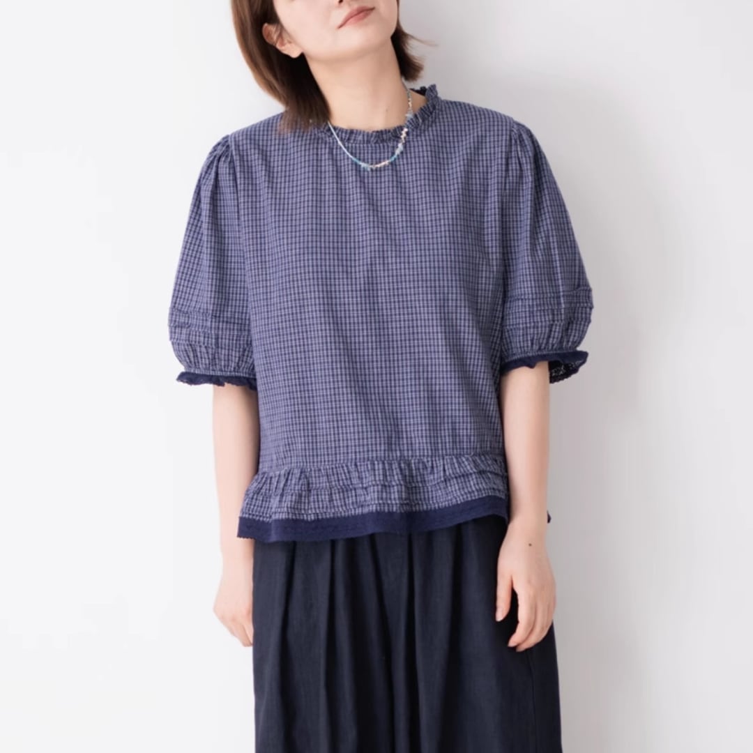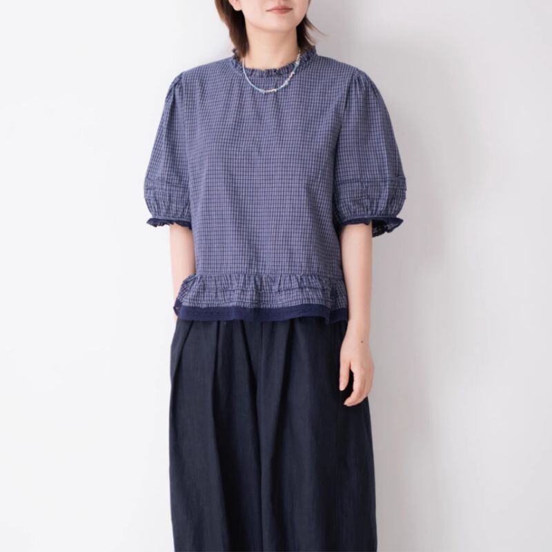 爽やかなチェック柄が魅力的なブラウス。パフスリーブと裾のフリルが、女性らしいシルエットを演出します。