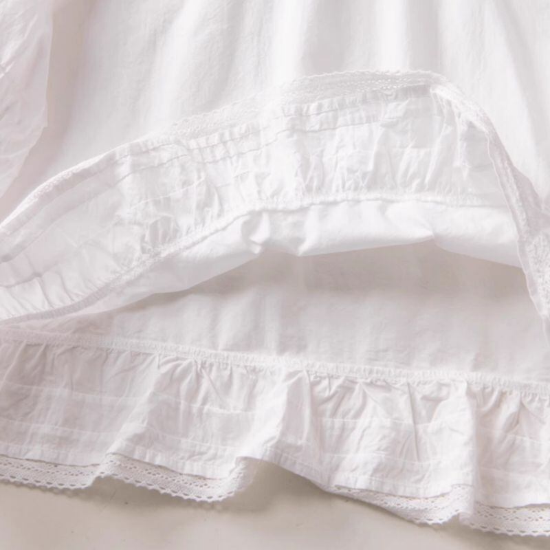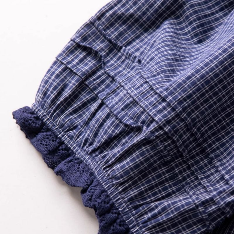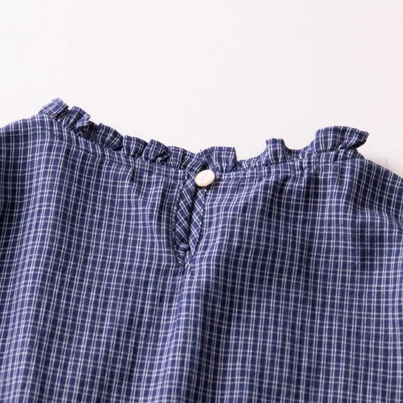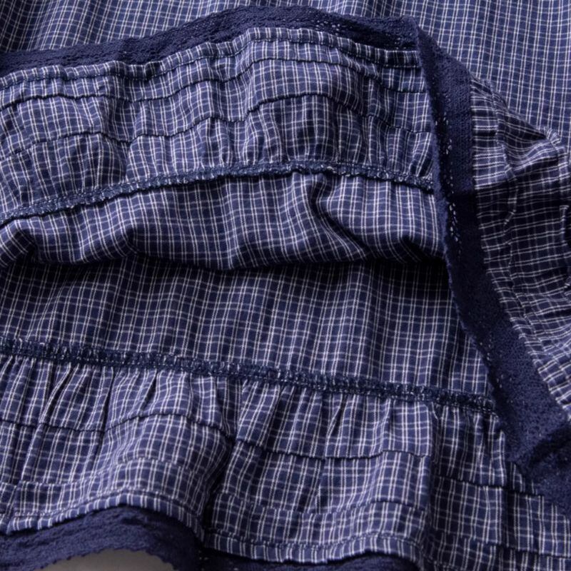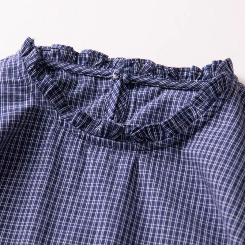 爽やかなチェック柄が魅力的なブラウス。パフスリーブと裾のフリルが、女性らしいシルエットを演出します。