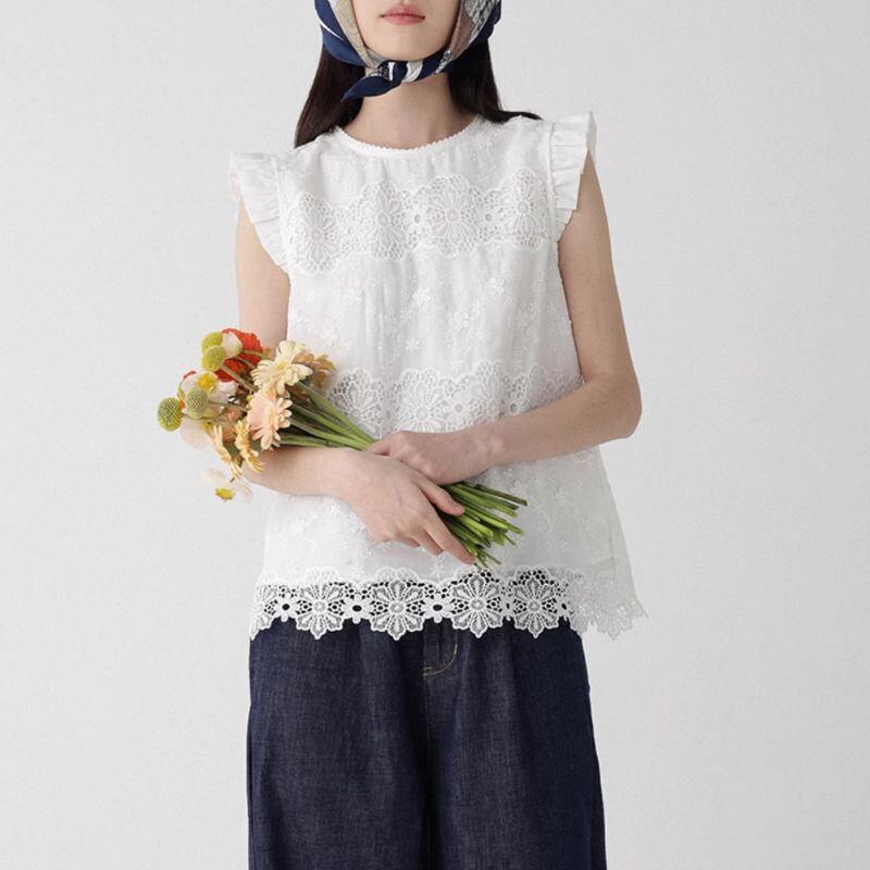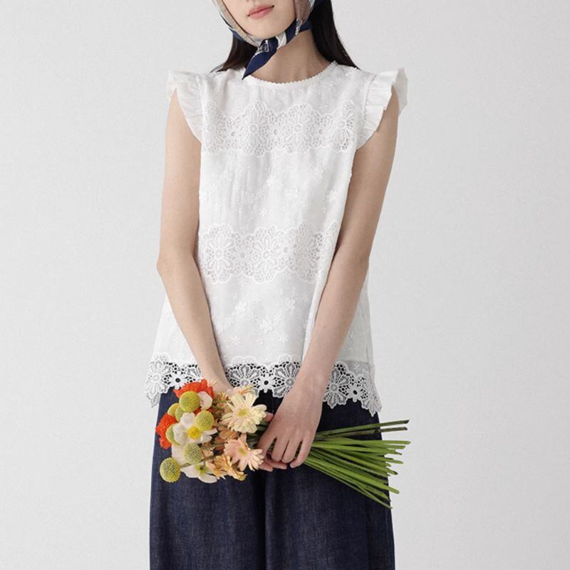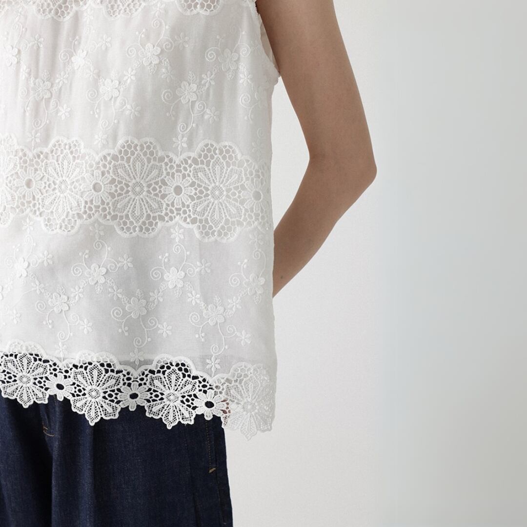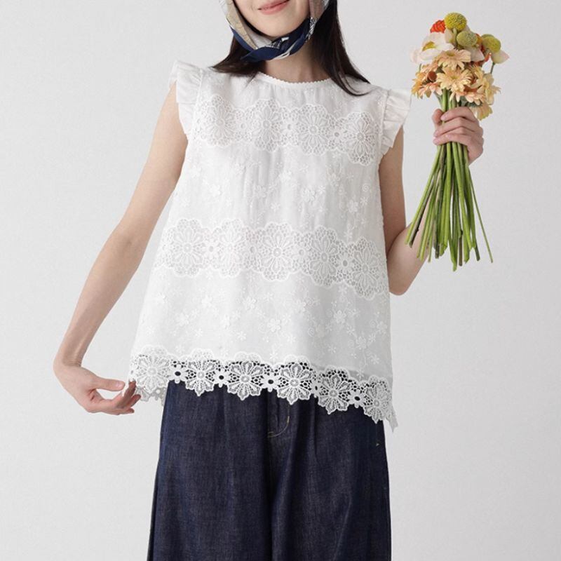 上品なレースのノースリーブブラウスで、夏の装いを華やかに。