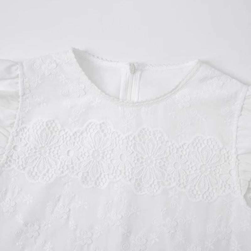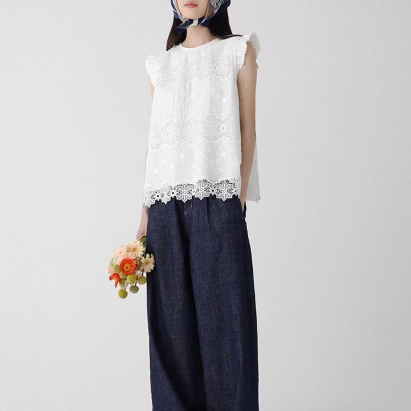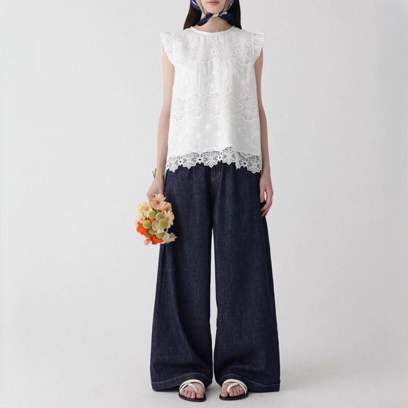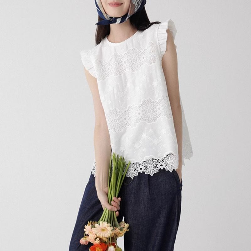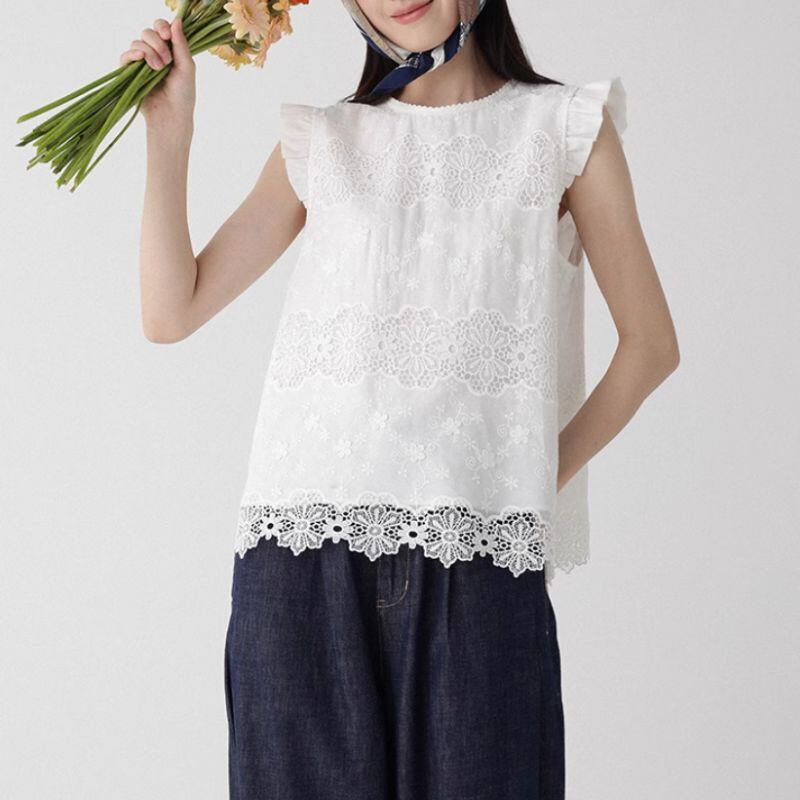 上品なレースのノースリーブブラウスで、夏の装いを華やかに。