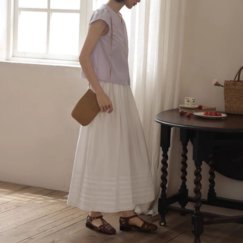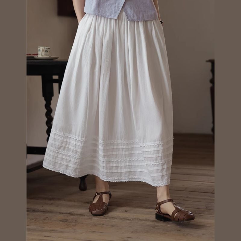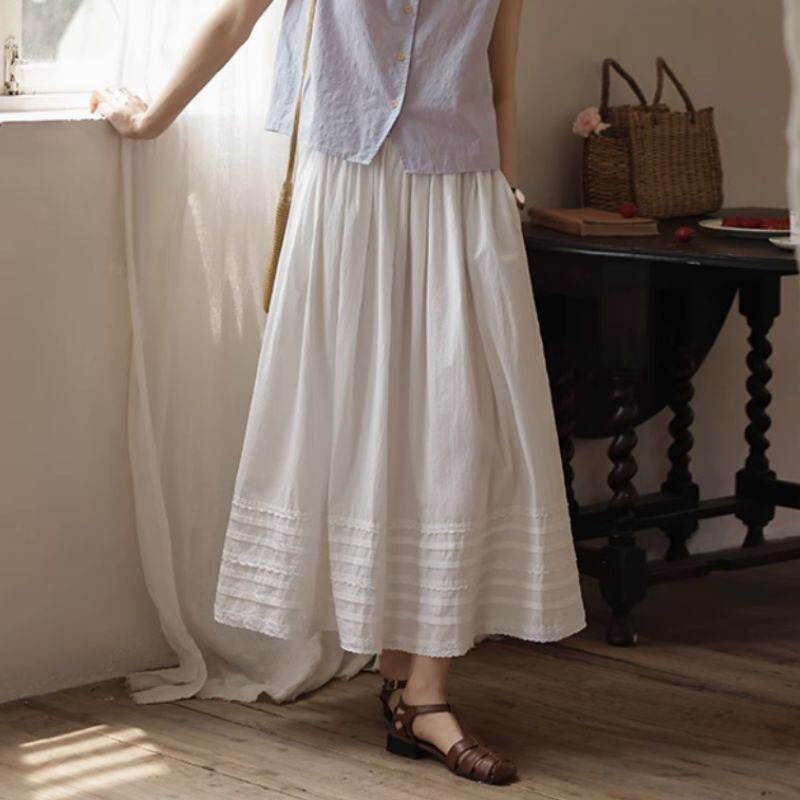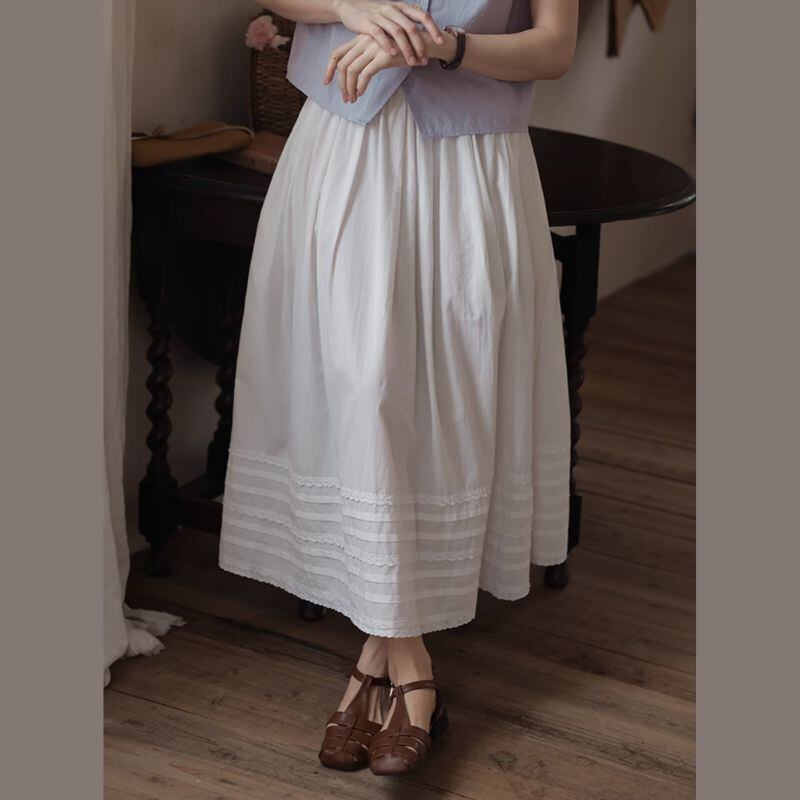 Aラインシルエットが美しいロングスカート。繊細なレースフリルがティアード状に施され、歩くたびに軽やかに揺れる姿は、女性らしさを最大限に引き立てます。
