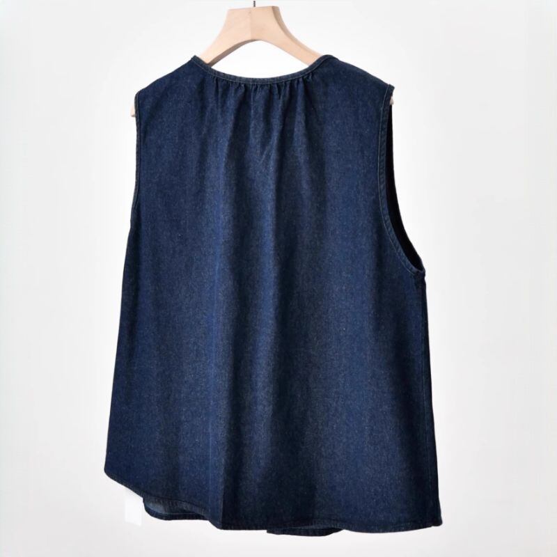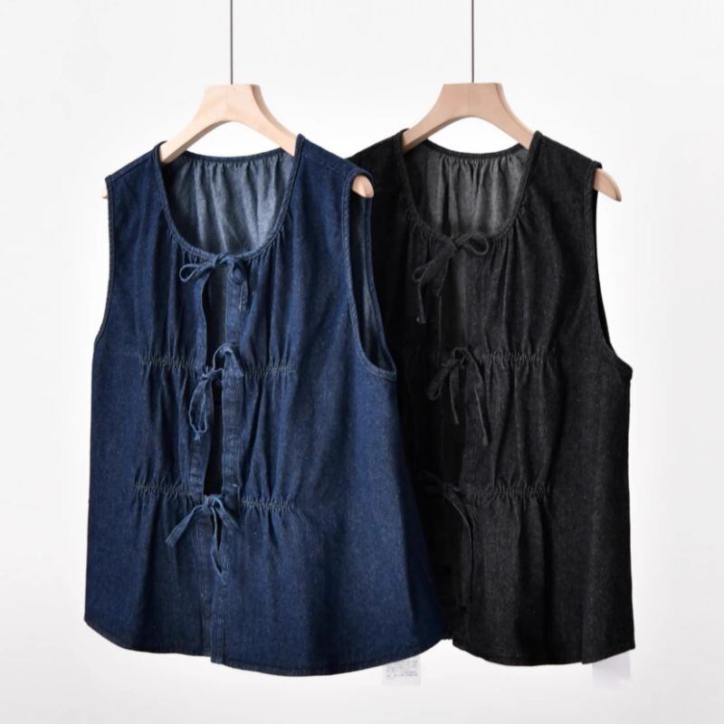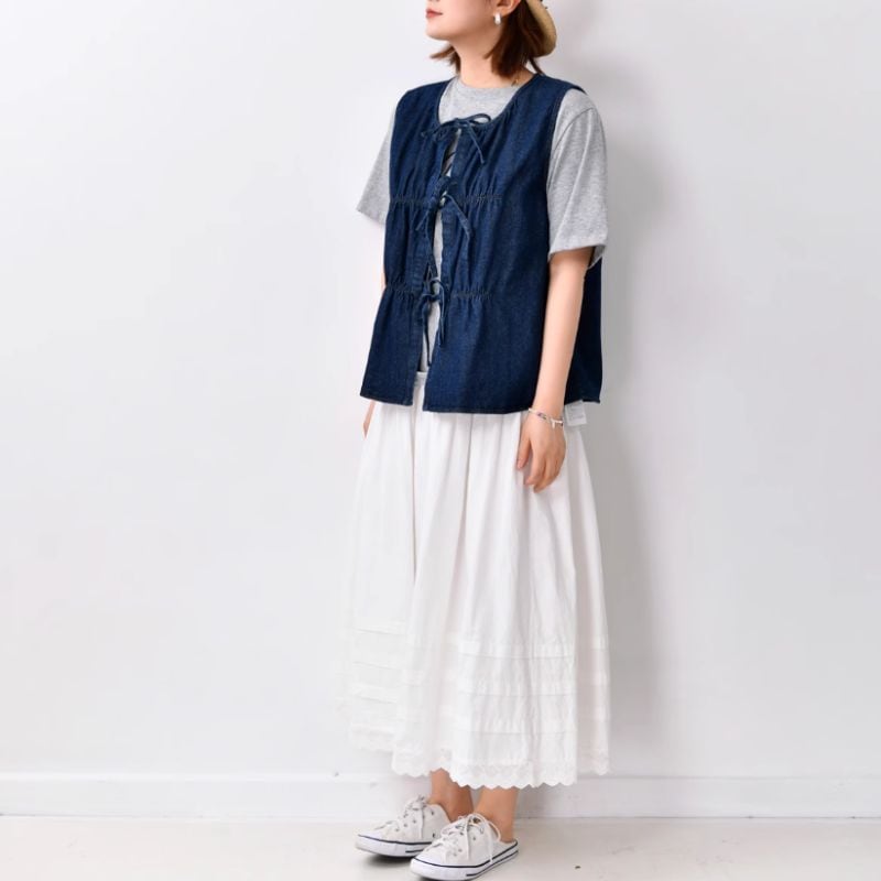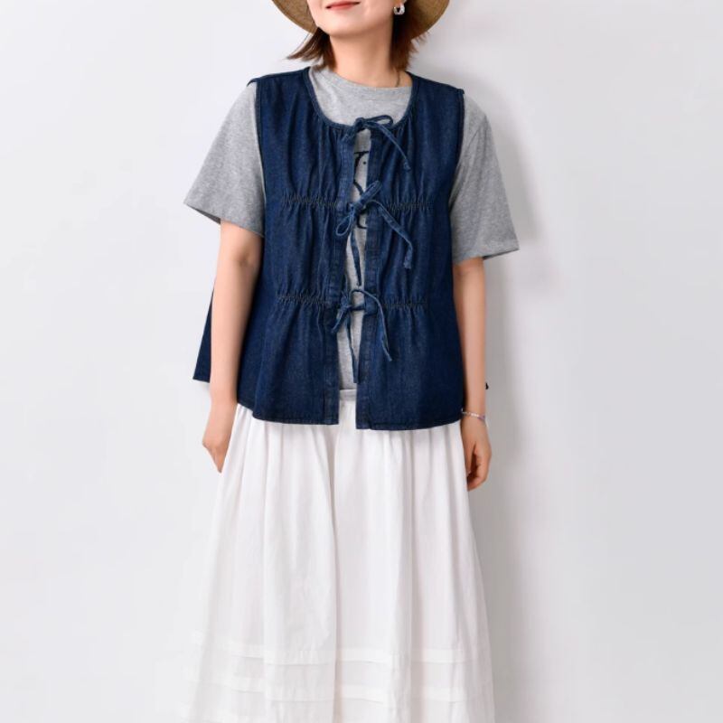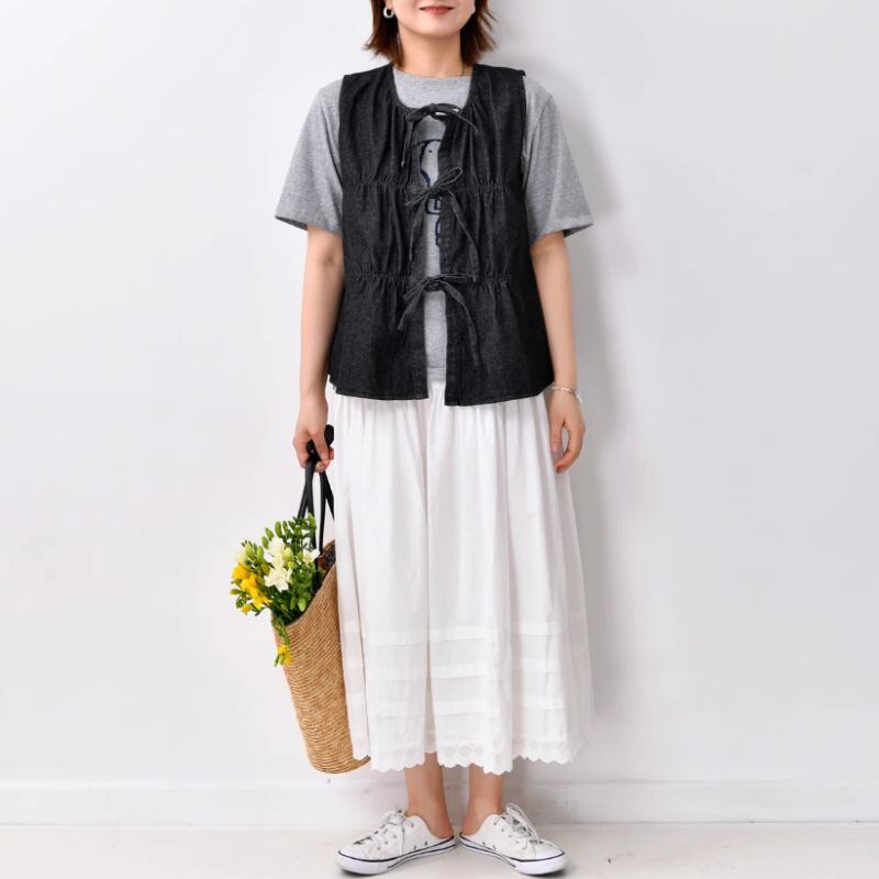 シンプルながらも、フロントのリボンデザインが目を惹くデザインベスト。程よくゆとりのあるAラインシルエットで、体型カバー効果も期待できます。