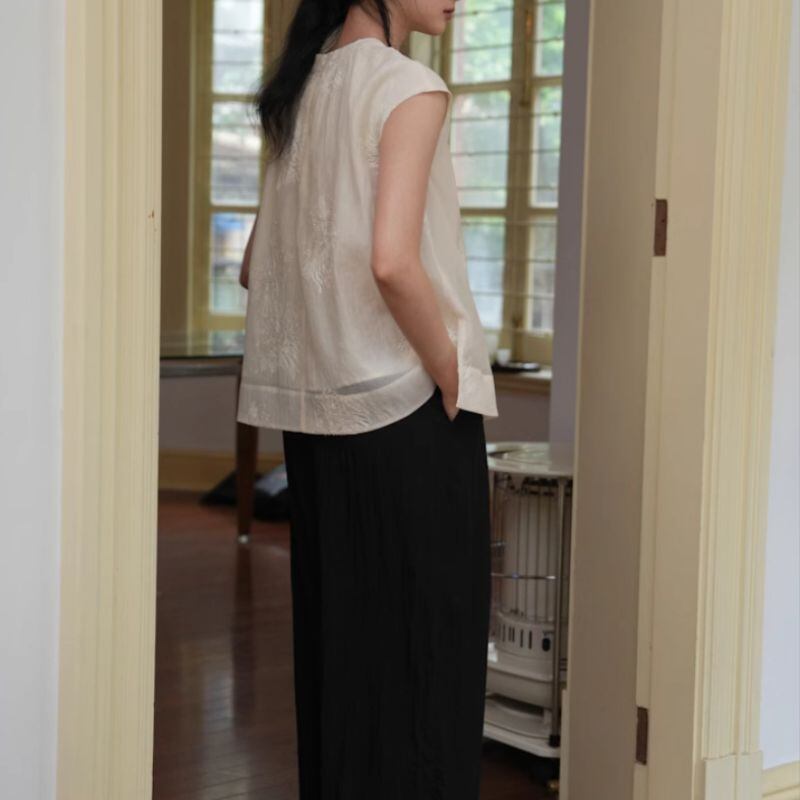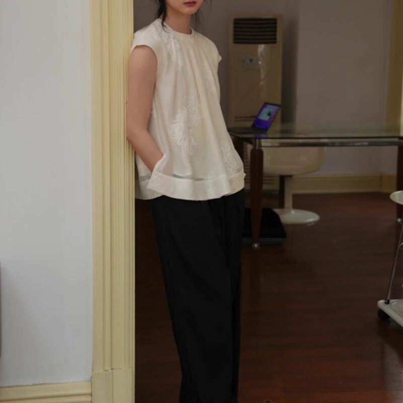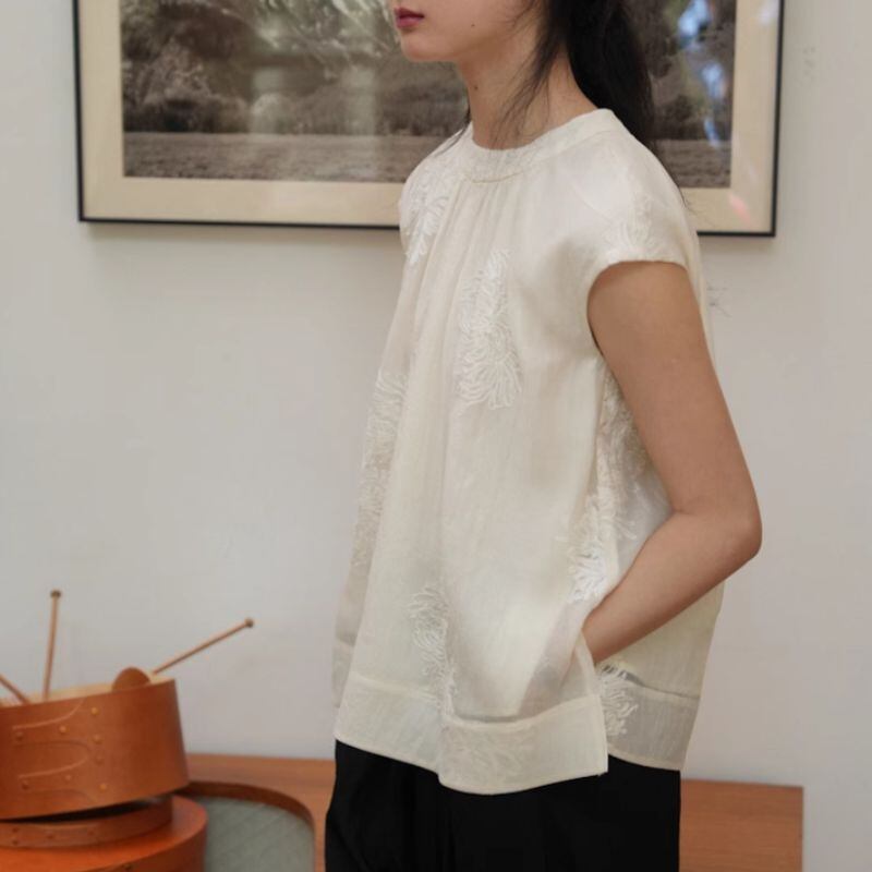 キャップスリーブとAラインシルエットが織りなす、女性らしい優美なブラウスです。さりげなく施された刺繍が、上品なアクセントになっています。