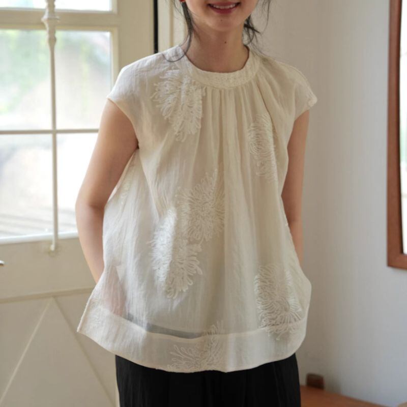 キャップスリーブAラインシルエット刺繍ブラウス M0378