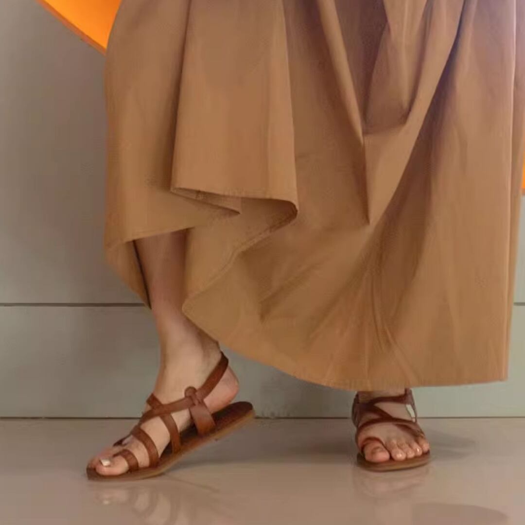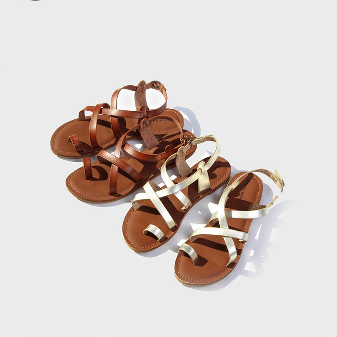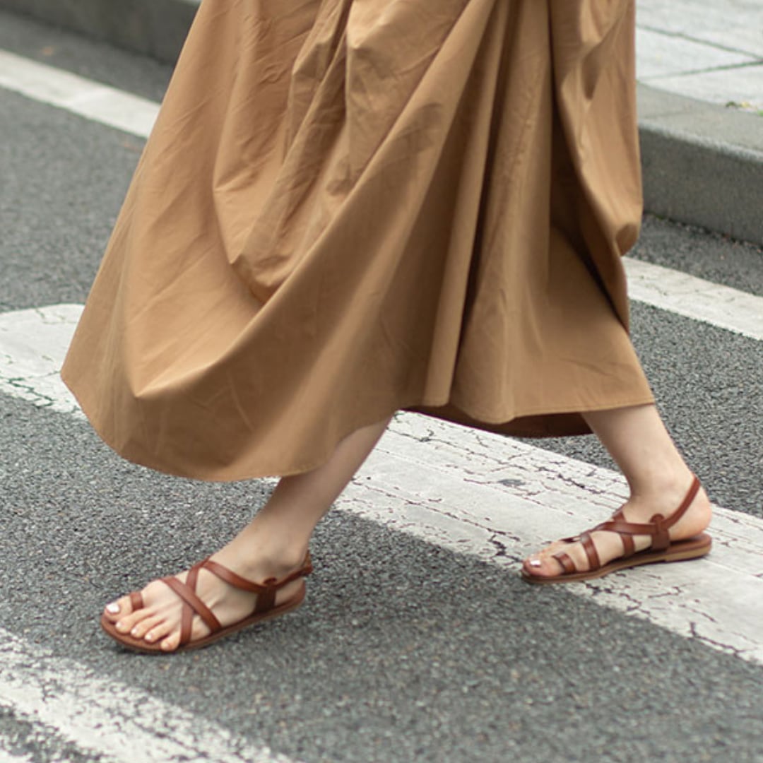 クロスストラップのデザインが足を美しく演出するフラットサンダル。アンクルストラップで安定感も抜群です。
