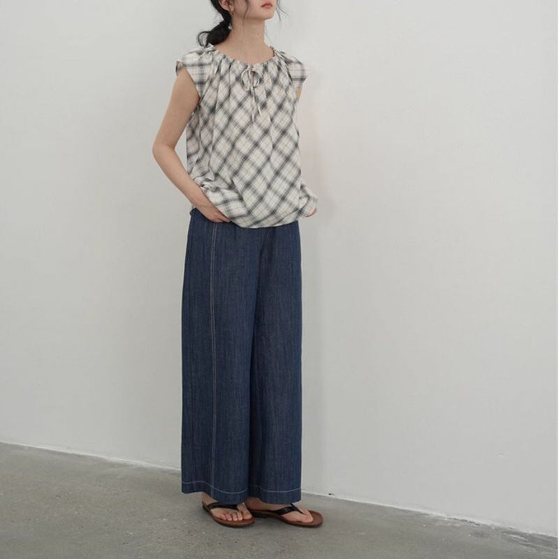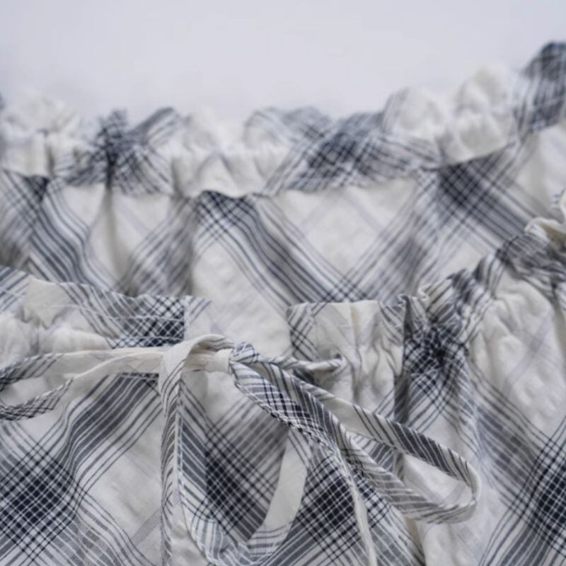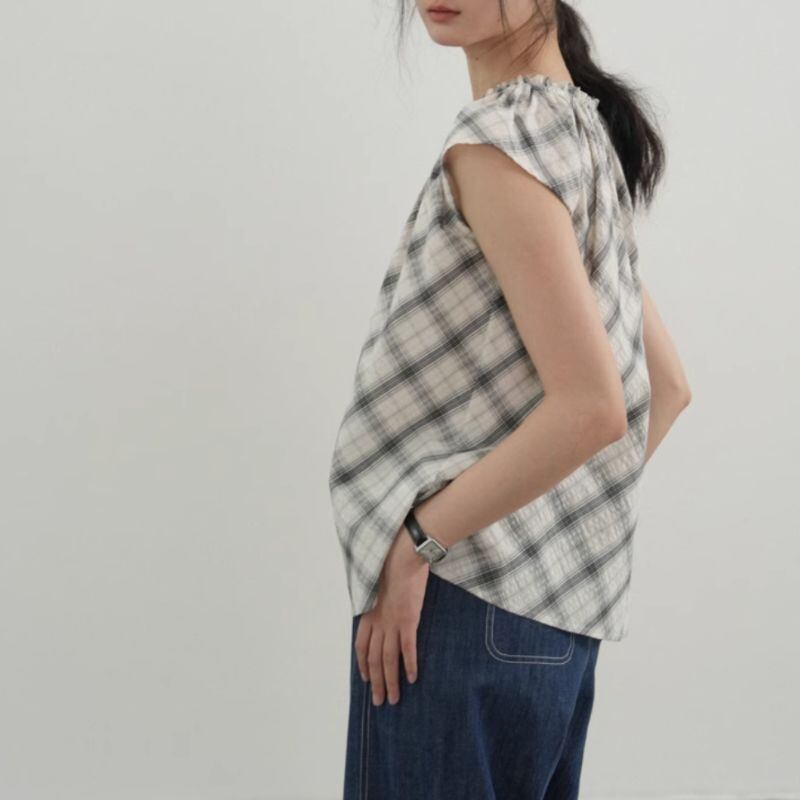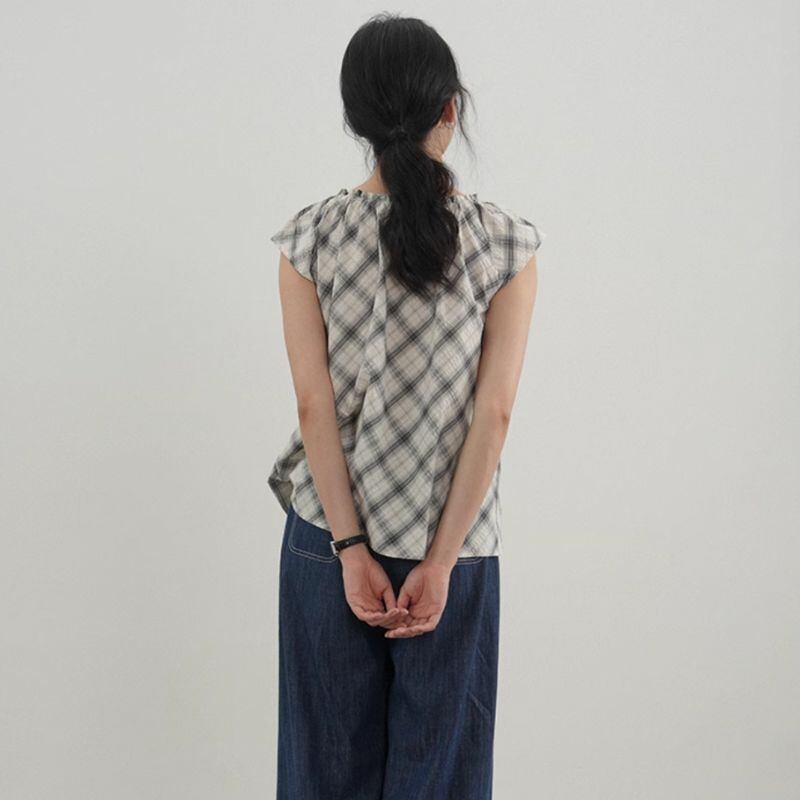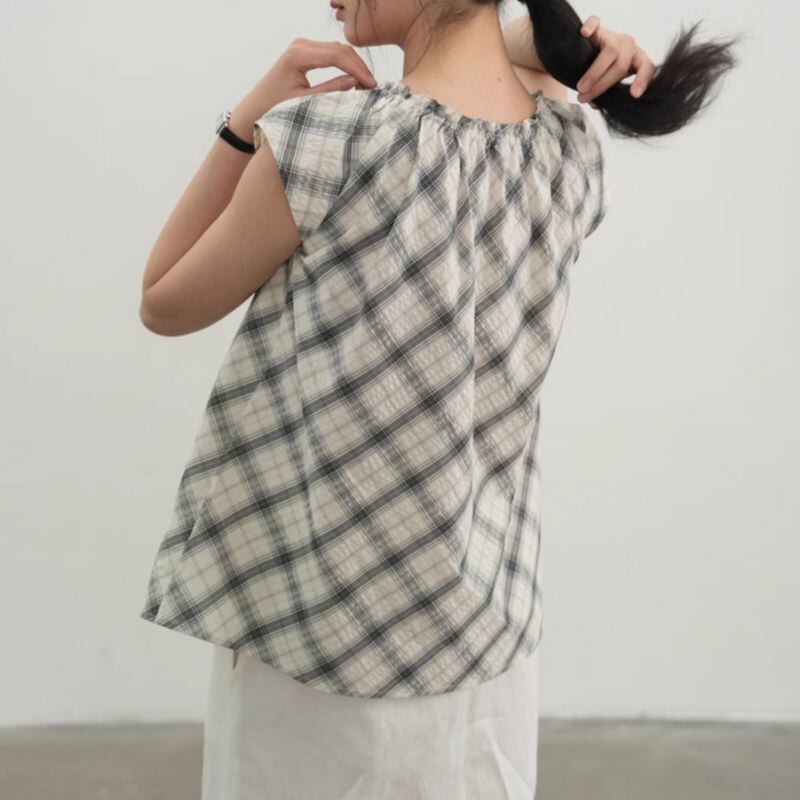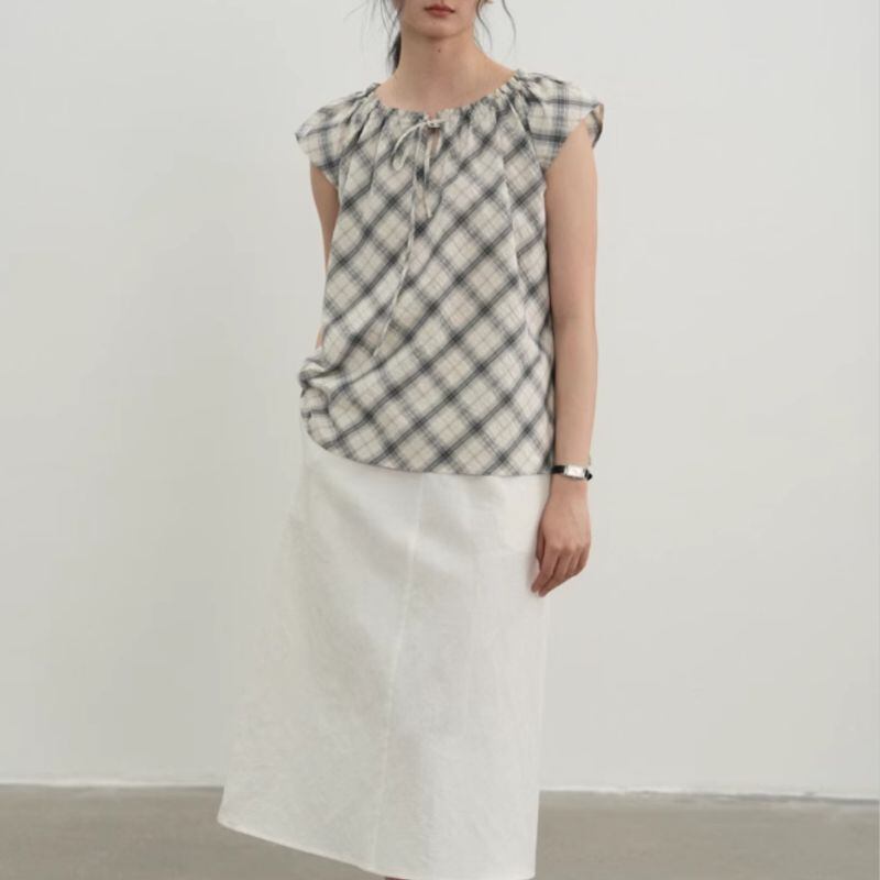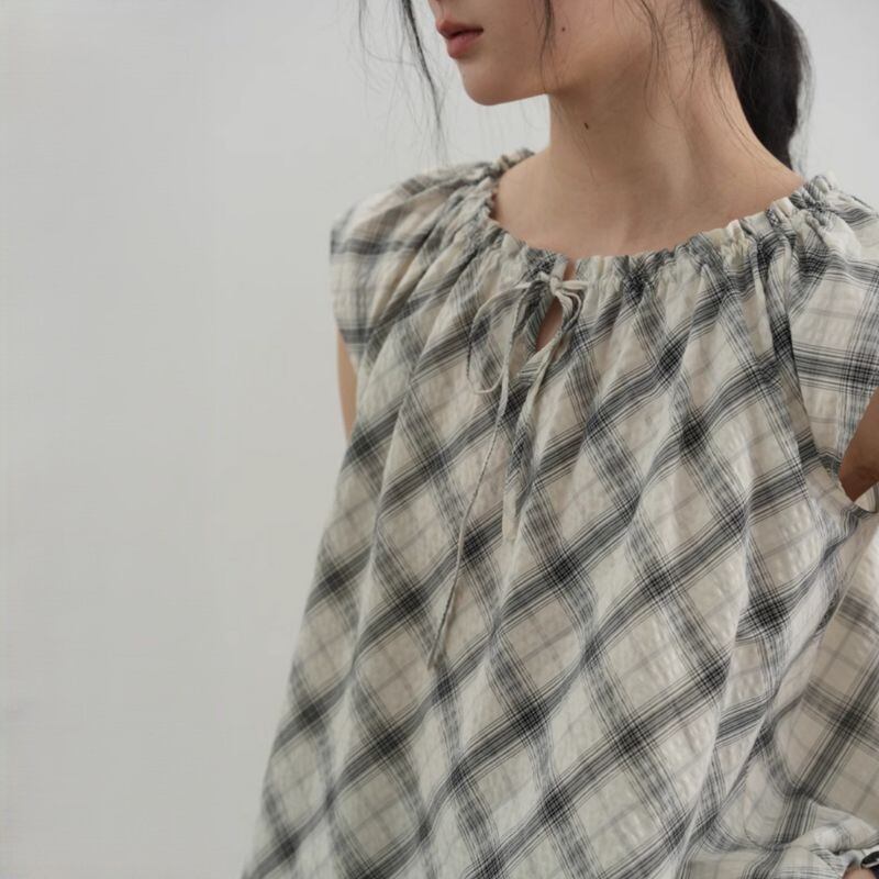フレンチスリーブとバイアスチェック柄が絶妙なバランスのブラウス。首元は紐で結ぶデザインとなっており、女性らしい可愛らしさを演出します。