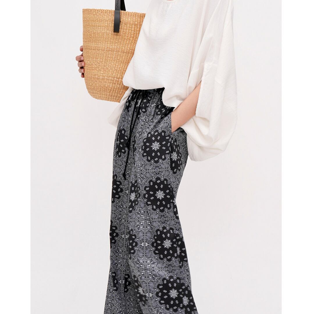 上品なペイズリー柄が印象的なバギーパンツ。