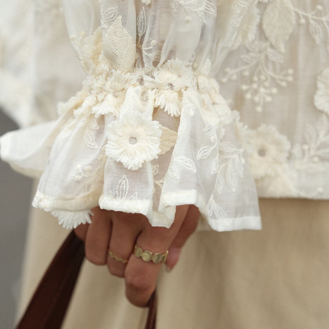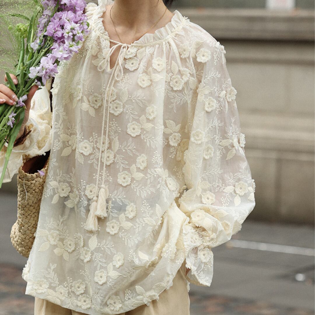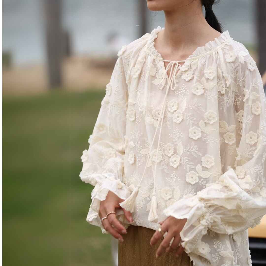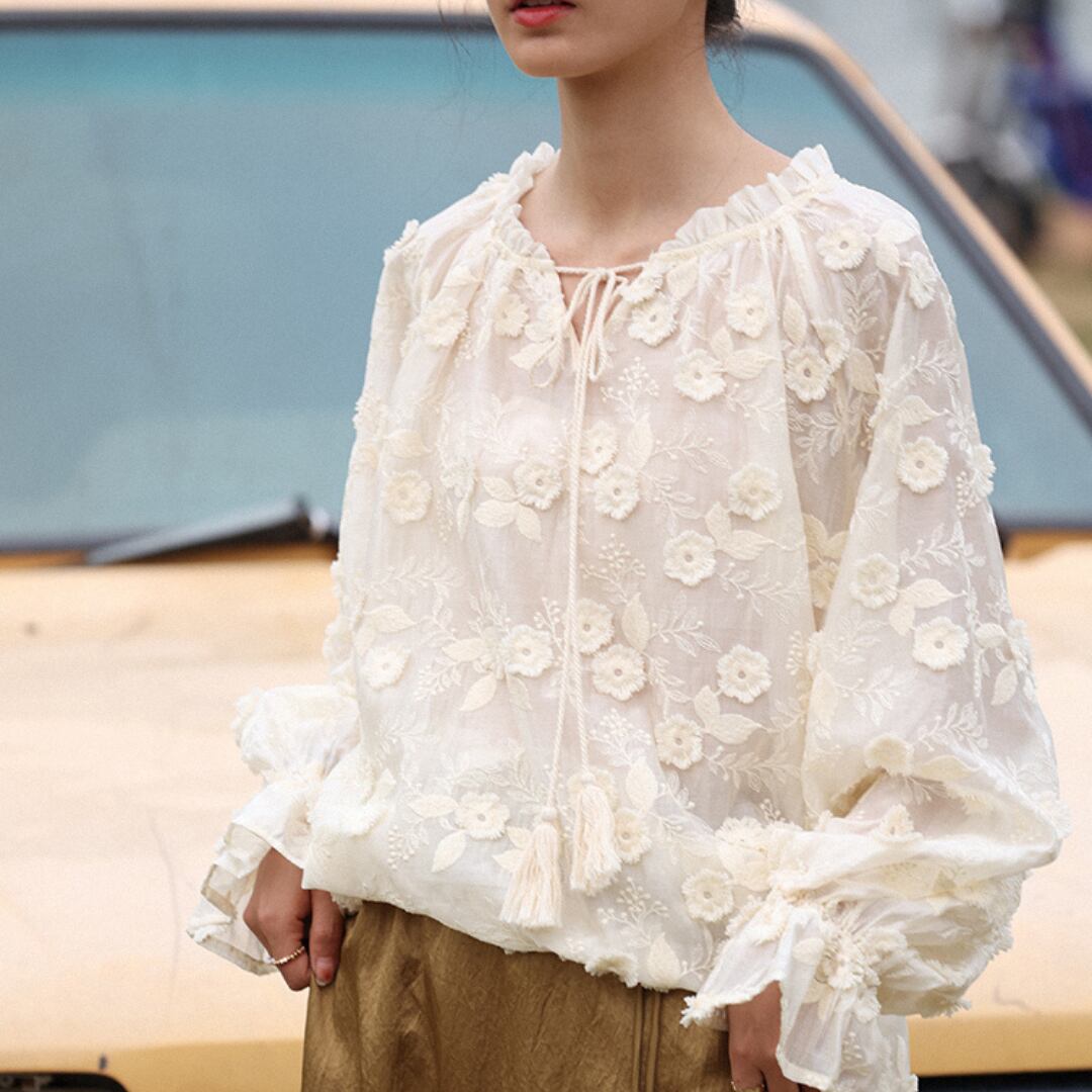 刺繍ドローストリングロングスリーブブラウス M0418