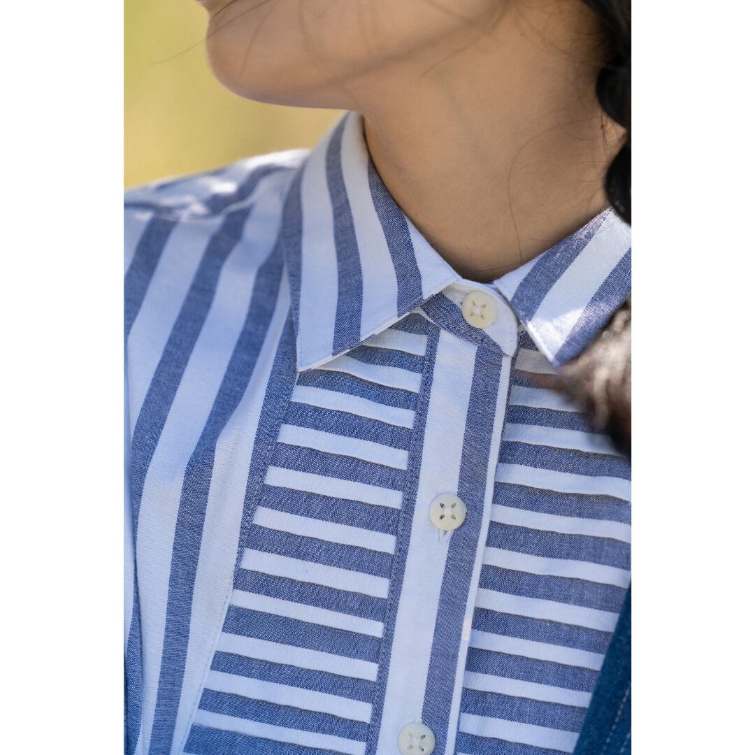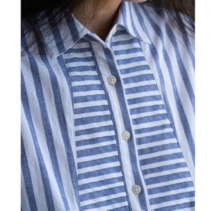 縦ストライプとヨークの横ストライプのデザインが目を引くボタンダウンシャツです。カジュアルながらも洗練された雰囲気を演出します。 オフィスシーンからオフスタイルまで幅広く活躍するアイテムです。