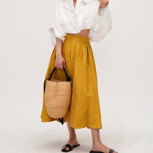 落ち着いたイエローカラーとボックスプリーツが、着こなしにさりげないアクセントを添えます。