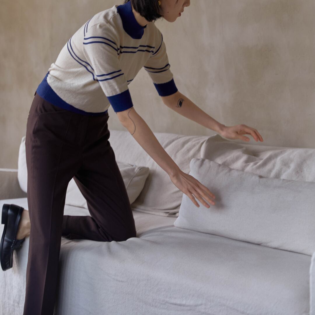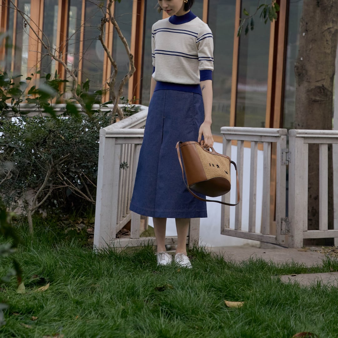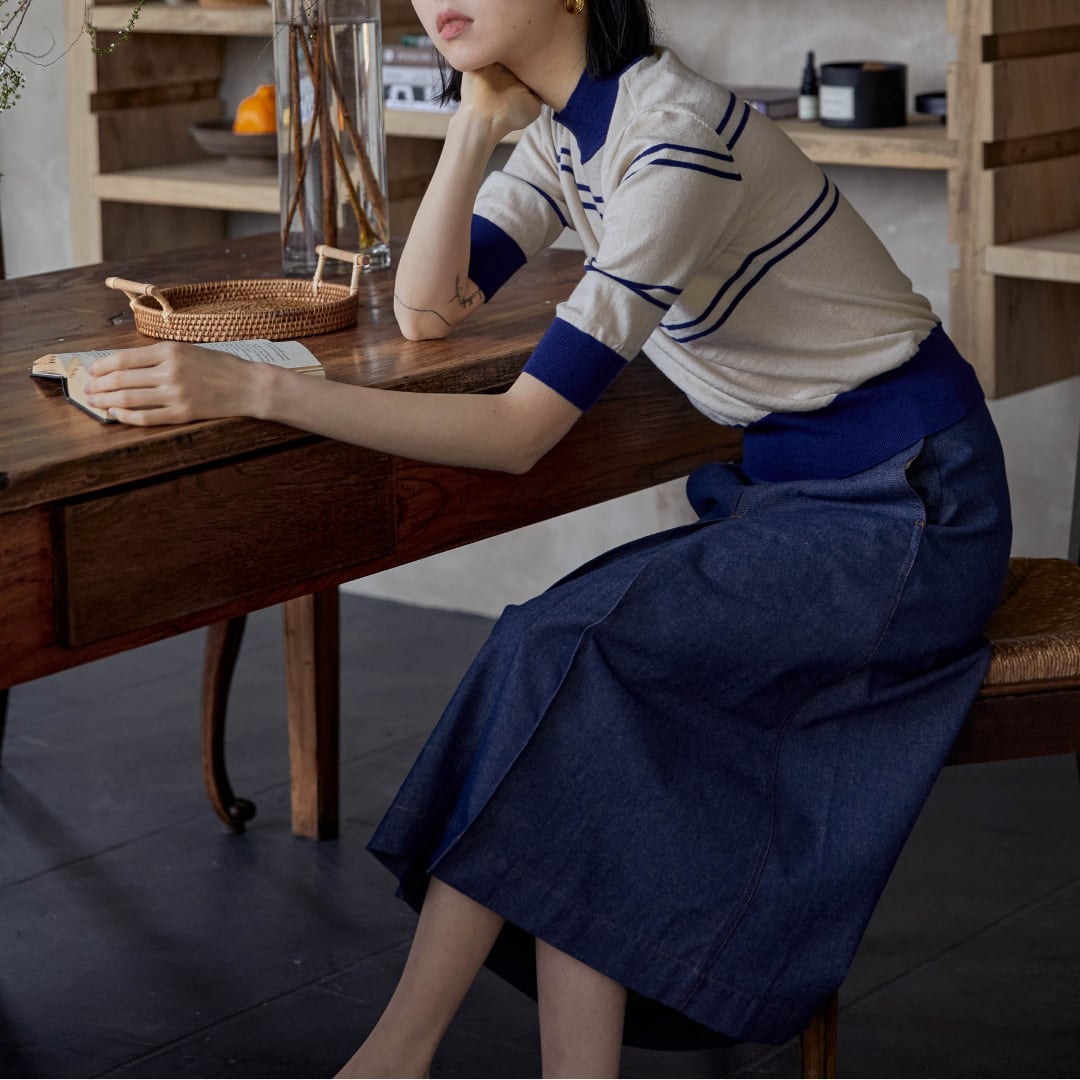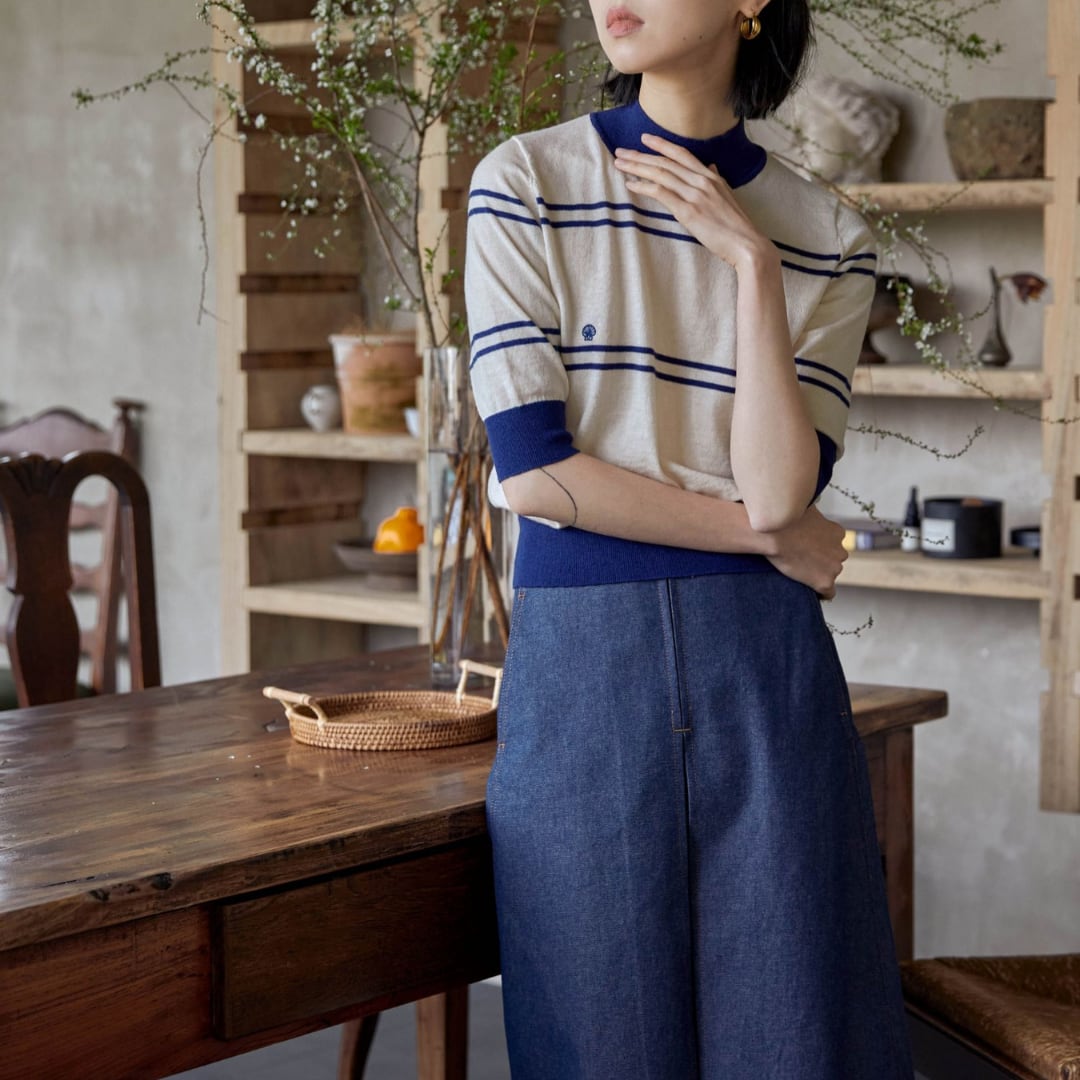 シンプルながらも存在感のあるボーダー柄七分袖ニットトップス。ハイネックのデザインが首元を美しく演出します。カジュアルなスタイルはもちろん、きれいめな着こなしにも合わせやすいアイテムです。