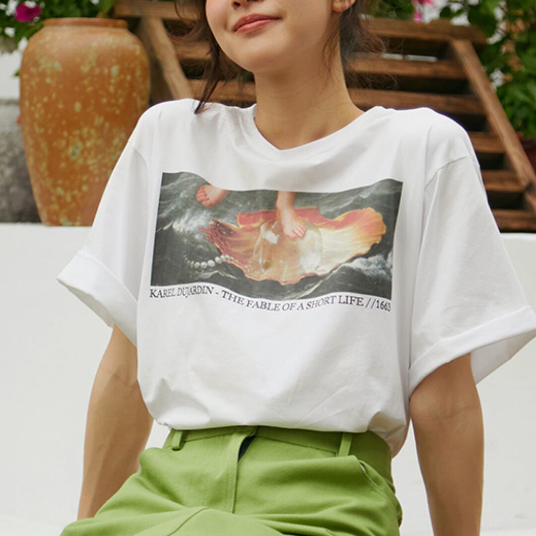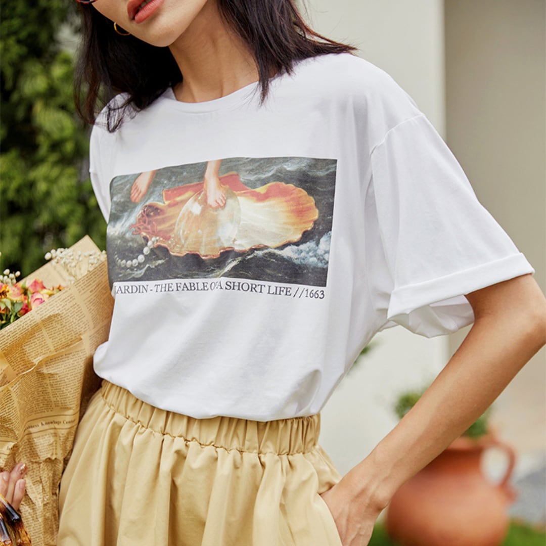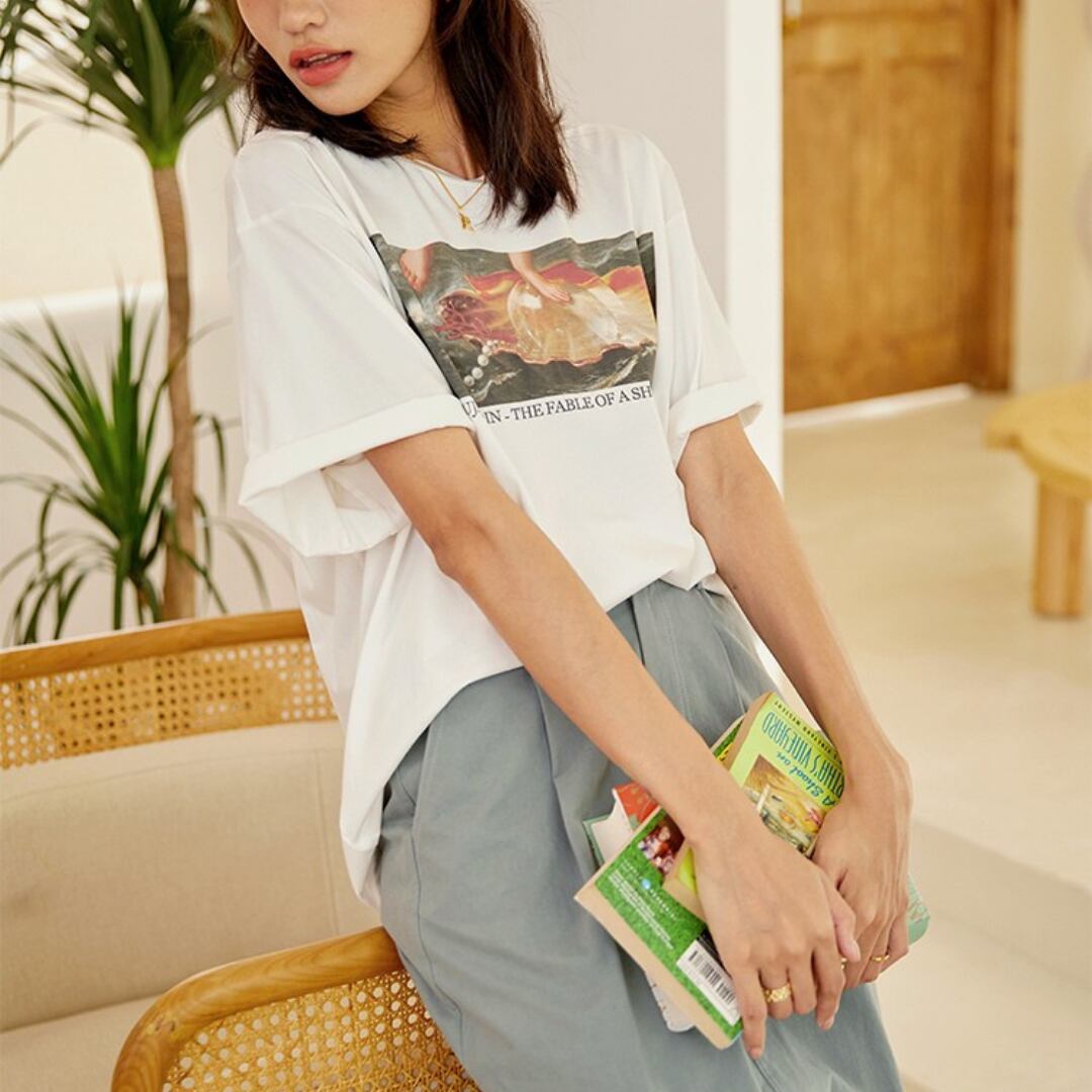 アートプリントが目を惹くクルーネックTシャツ。ボックスシルエットでゆったりとした着心地が魅力です。一枚で着ても、レイヤードスタイルにも活躍するアイテムです。