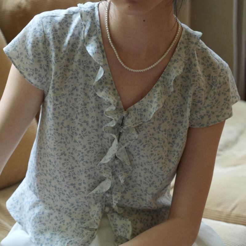 繊細なフリルとVネックが女性らしい魅力を引き立てるブラウスです。爽やかな小花柄が、春の装いにぴったり。